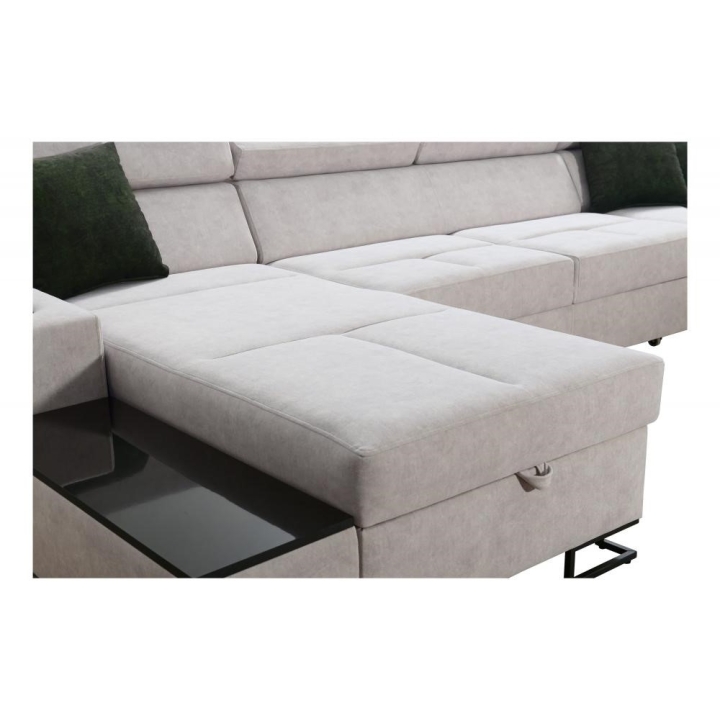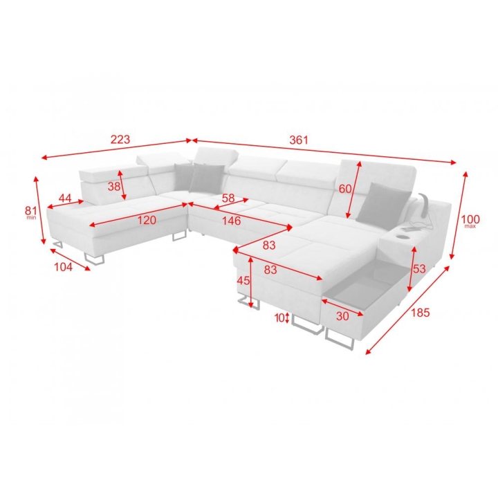 The sofa is equipped with 6 adjustable headrests, allowing precise customization of support. It also includes 2 bedding storage compartments and an opening bar, expanding storage and utility options. An integrated multifunctional lamp with USB charging and a flexible arm, powered by 12V/230V, provides neutral light color for added convenience.