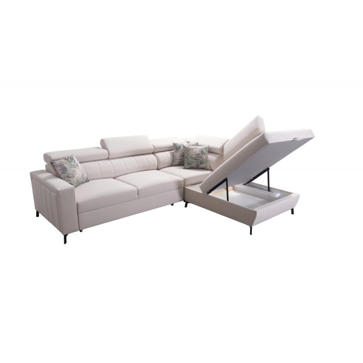 The construction is based on wave springs and hardened T-30 foam, ensuring durability and proper resilience. The structure is reinforced with a frame made of solid wood combined with particle board, which guarantees stability. The corner sofa is equipped with 5 adjustable headrests, allowing individual adjustment of the backrest position.
