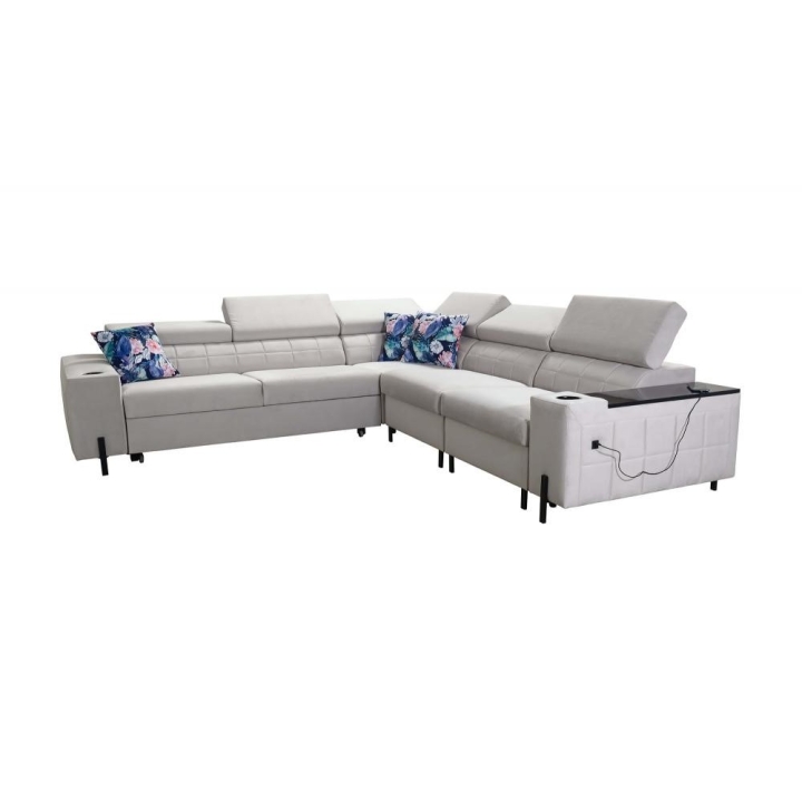 The furniture is equipped with 6 adjustable headrests, allowing individual backrest positioning. It also features 2 bedding storage compartments and an opening bar, increasing storage possibilities. The entire structure is built on wave springs and reinforced T-30 foam, using top-quality upholstery fabrics, and strengthened with a frame made of wood combined with particle board.