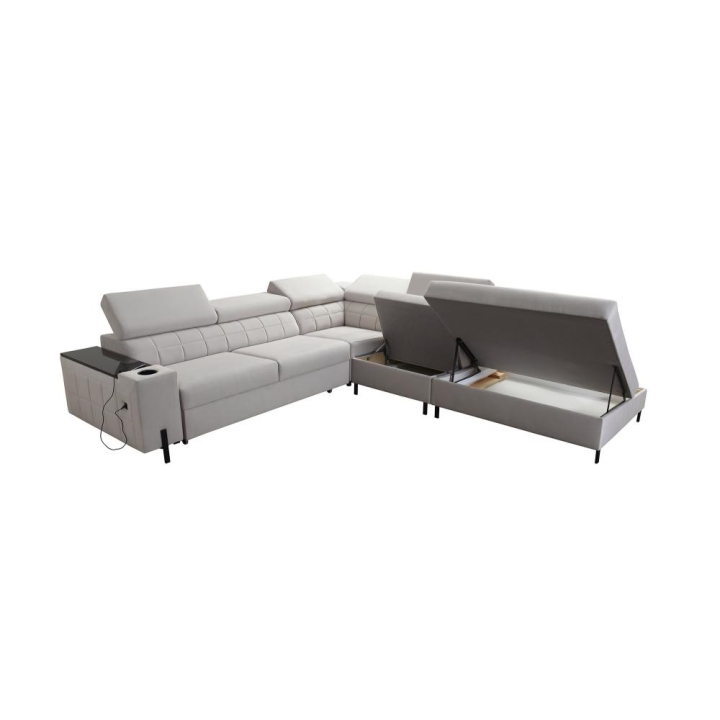 The sofa is equipped with 6 adjustable headrests, enabling personalized back support. It also features 2 bedding storage compartments and a built-in opening bar, discreetly integrated into the structure. These elements enhance daily comfort and usability.