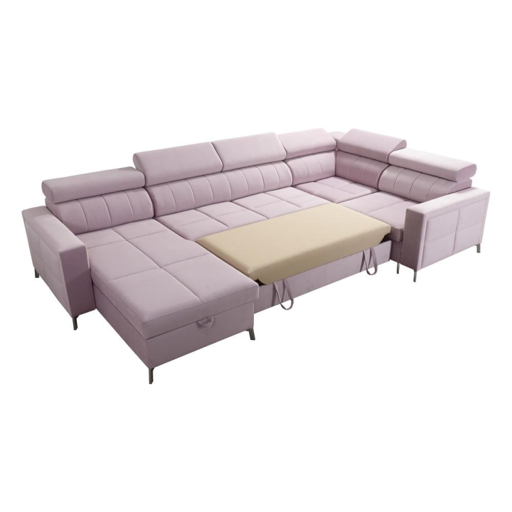 The corner sofa’s construction is based on wave springs and reinforced T-30 foam, ensuring proper elasticity and long-term durability. The entire structure is strengthened with a frame made of solid wood combined with particle board, which enhances stability during everyday use. User comfort is further increased by 6 adjustable headrests, allowing for individual backrest positioning.