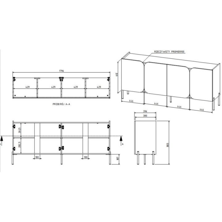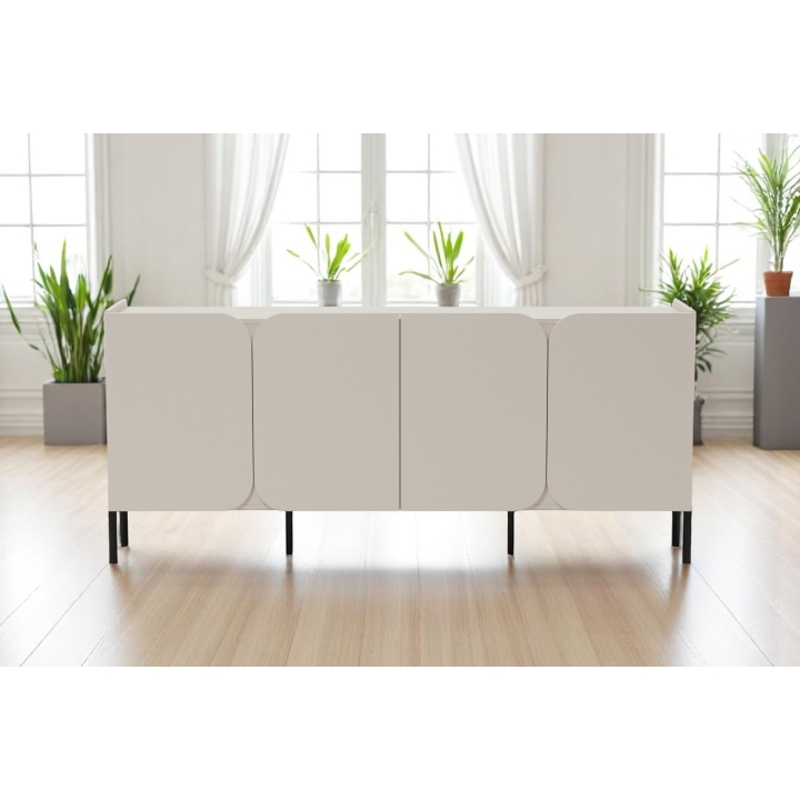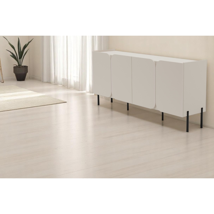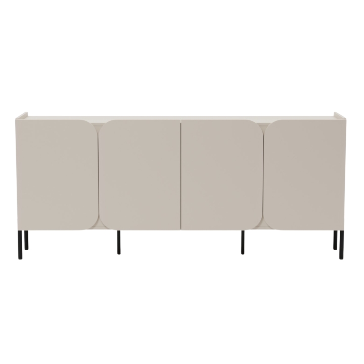 The structure was made of 16 mm thick MDF - both the fronts and the body present a uniform cashmere shade. The chest of drawers is 179.6 cm wide and 38 cm deep, making it a piece of furniture with well-balanced proportions. This form will work well both as a main accent in the living room and as a complement to the bedroom decor.