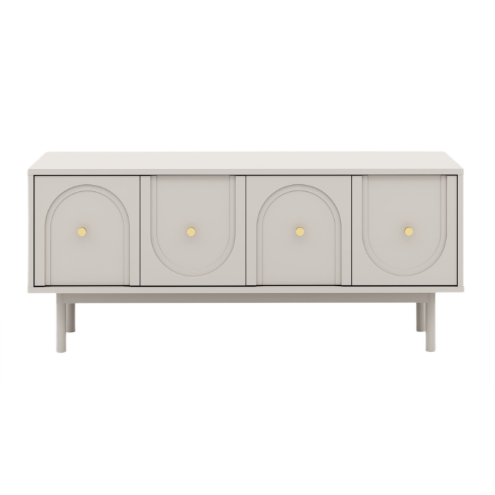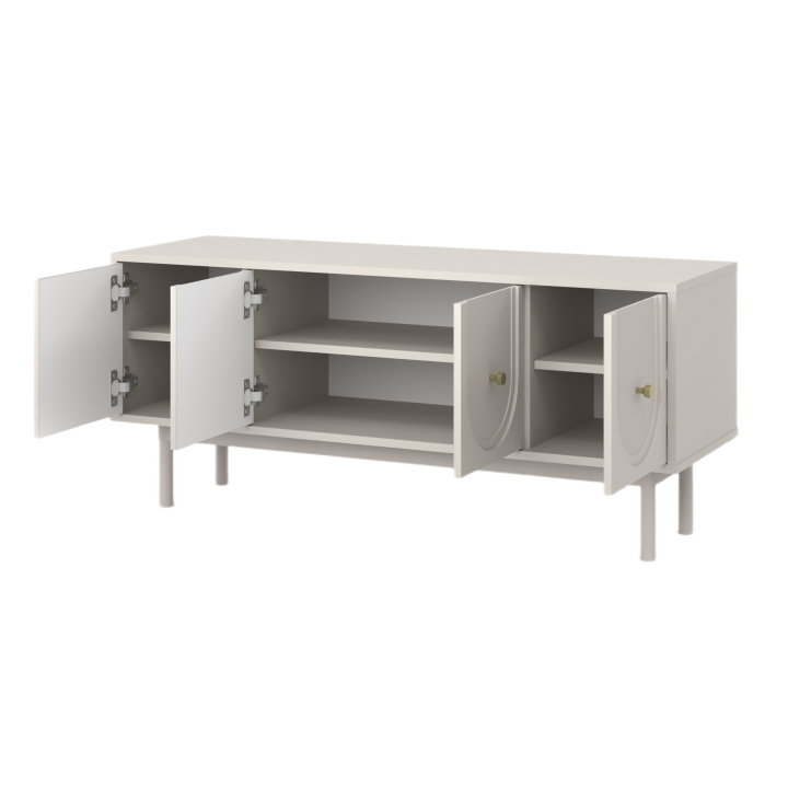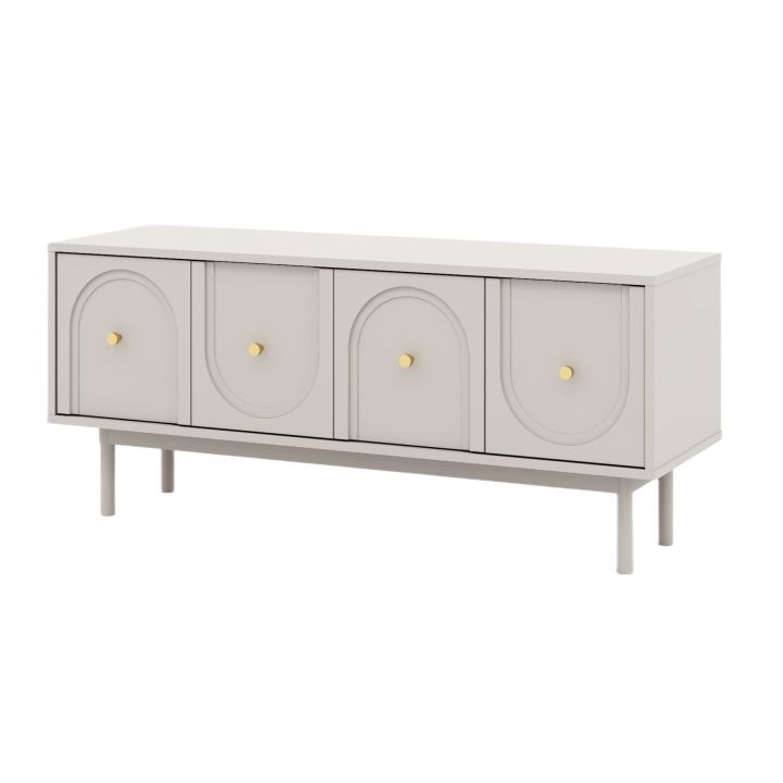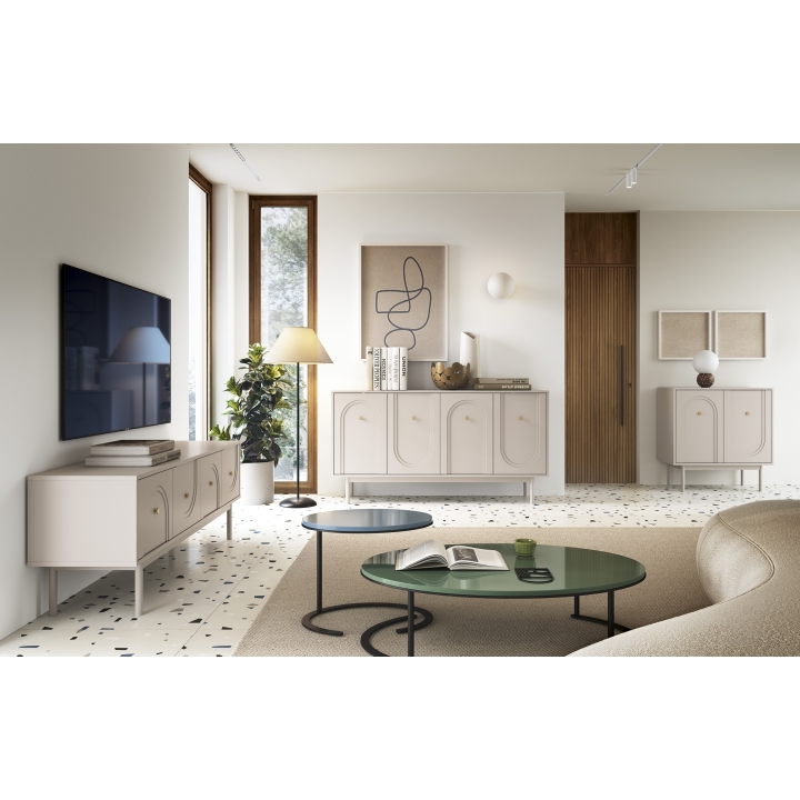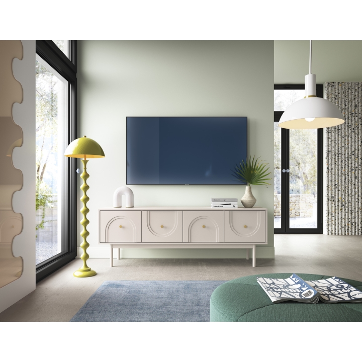 The RTV cabinet from the Mazoma collection is a piece of furniture with a balanced form, maintained in a delicate cashmere shade that brings calm and order to the interior. A characteristic detail is the subtly profiled arch on the fronts, which is the hallmark of the entire collection. Thanks to its design, it will be perfect as a base for a home multimedia centre.