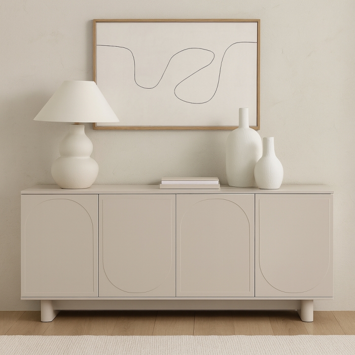 The whole, kept in the color of cashmere, brings subtle character and grace to the interior. A delicate shade of beige creates a neutral background, which allows you to freely combine the furniture with both light accents and darker decorative elements. Such a solution makes the dresser remain a universal design element, giving the interior coherence and character.
