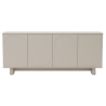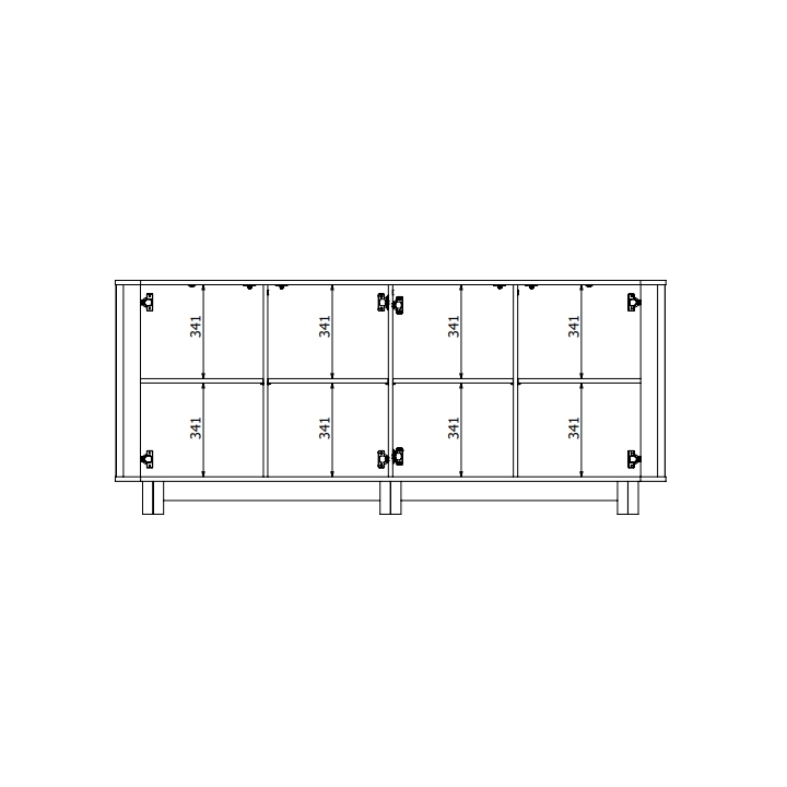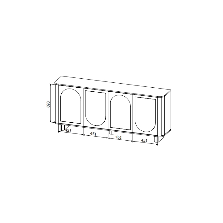 The dimensions of the chest of drawers include 200 cm in width, 85 cm in height and 40 cm in depth, making it a capacious and proportional piece of furniture. The height of the body alone, without the legs, is 69 cm. The design includes four doors, behind which there are individual shelves, so the interior space is clearly divided and allows convenient organization.