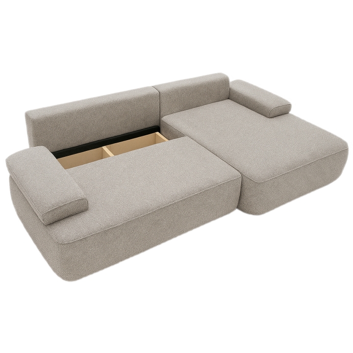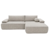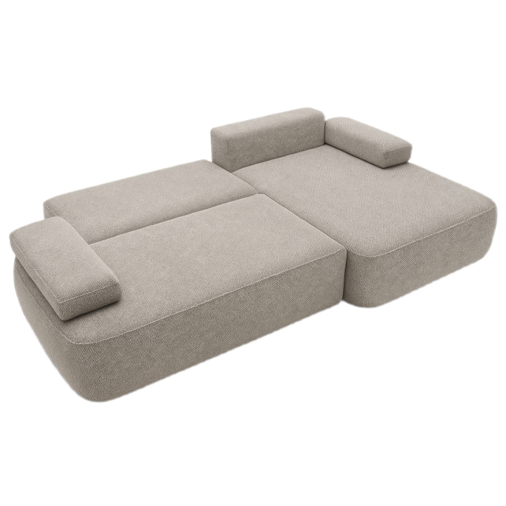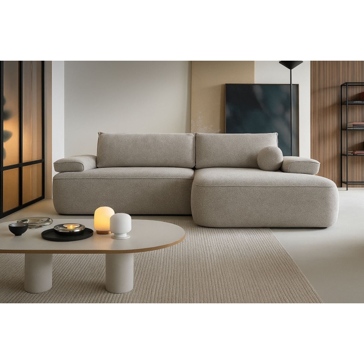 The fast shipping offer applies specifically to the right-hand facing version upholstered in Mora 05 fabric. This fabric features a distinctive three-dimensional texture in a neutral beige shade. The pattern is created by subtle raised and recessed elements, achieved through the combination of yarns of varying thickness and a special weaving technique, giving the upholstery depth and visual interest.
