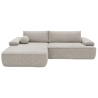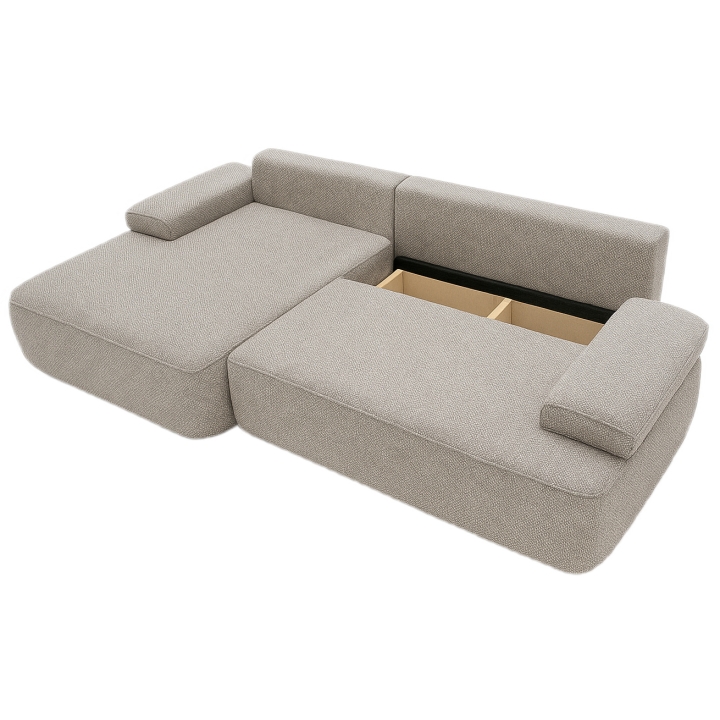 The fast shipping offer applies to the left-hand facing version upholstered in Mora 05 fabric. This fabric features a distinct three-dimensional texture in a universal beige shade. Its pattern is created by subtle raised and recessed elements, achieved through the use of yarns of varying thickness and a special weaving technique, giving the upholstery depth and character.