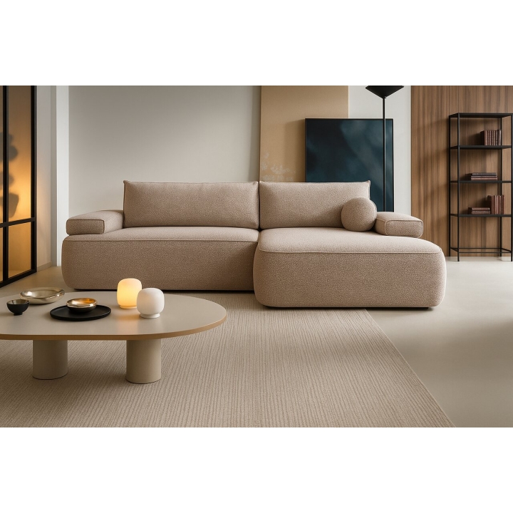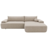 The fast shipping offer applies to the right-hand facing version upholstered in Mora 24 fabric. This upholstery features a distinctive three-dimensional texture in a neutral beige shade. The surface pattern is created by subtle raised and recessed elements, achieved through a combination of yarns of varying thickness and a special weaving technique, giving the fabric depth and visual interest.