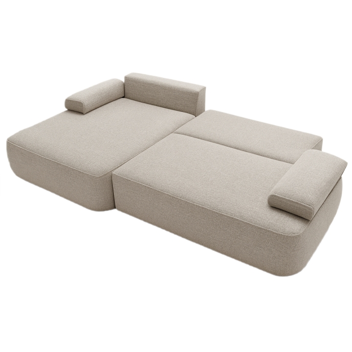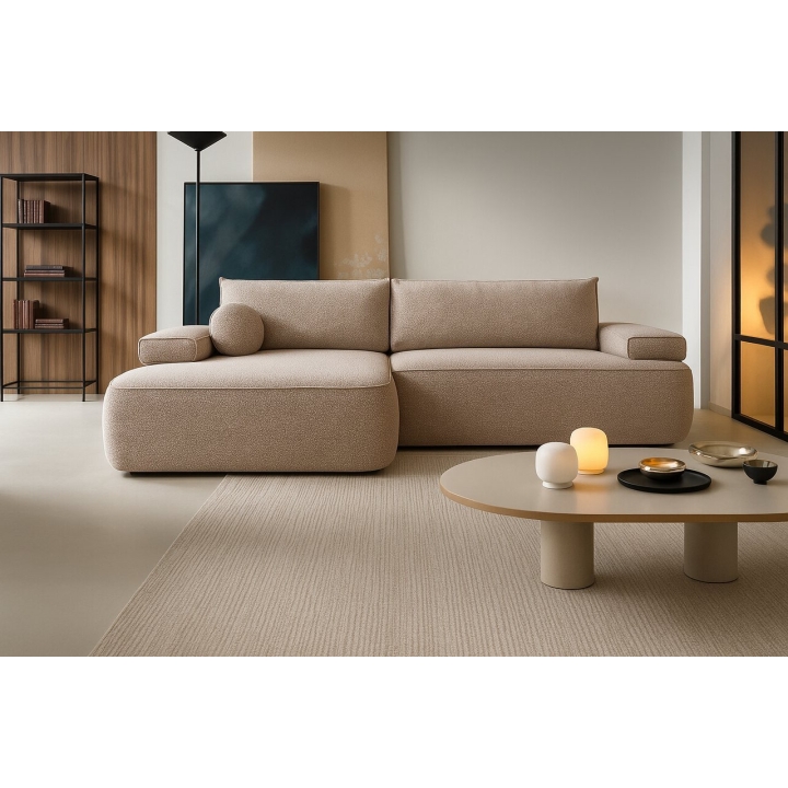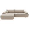 The fast shipping offer applies to the left-hand facing version upholstered in Mora 24 fabric. This upholstery features a distinctive three-dimensional texture in a neutral beige shade. The surface pattern is created by subtle raised and recessed elements, achieved through a combination of yarns of varying thickness and a special weaving technique, giving the fabric depth and visual interest.