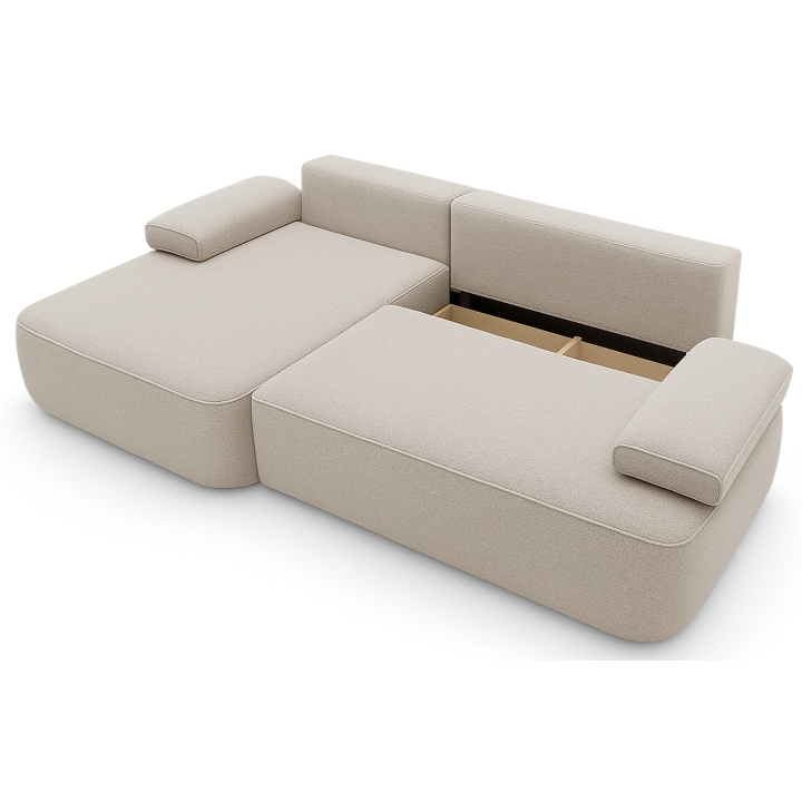 The DL unfolding mechanism allows the seat to slide forward while the backrest folds down, creating a flat and comfortable sleeping surface measuring 215 × 135 cm. This practical solution makes it easy to quickly transform the sofa into a full-size sleeping area, without the need for excessive force. A spacious bedding storage compartment is integrated into the structure, helping to keep the living area tidy and well organized.