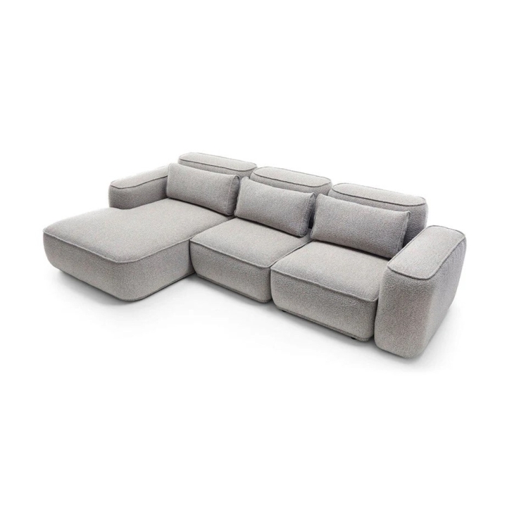 The Buffalo corner sofa features modern design, emphasized by its distinctive silhouette and carefully selected materials. Its bouclé upholstery in Legend 4 fabric provides a pleasant texture and gives the piece a character typical of contemporary interiors. The model is available in right- or left-hand configurations, making it easy to adapt to the room layout.