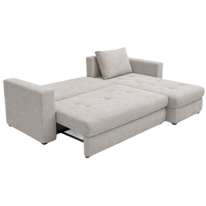 The Nido corner sofa includes a bedding storage compartment and a practical sleeping function. The sleeping area measures 150 × 210 cm. The DL mechanism operates by pulling the seat forward and folding the backrest flat into the available space, creating a comfortable sleeping surface for overnight use.
