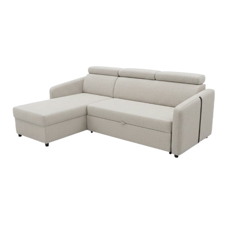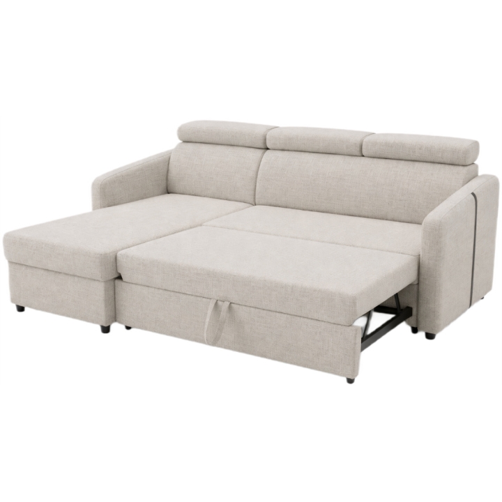 The Mito corner sofa includes a bedding storage compartment and offers an occasional sleeping function. The sleeping function is operated using the dolphin mechanism, which allows quick conversion into a bed. The mechanism works by pulling out the lower drawer and lifting the mattress to seat level, creating a flat sleeping area measuring 125 × 195 cm.