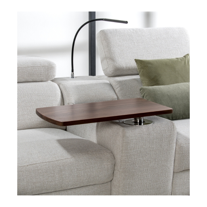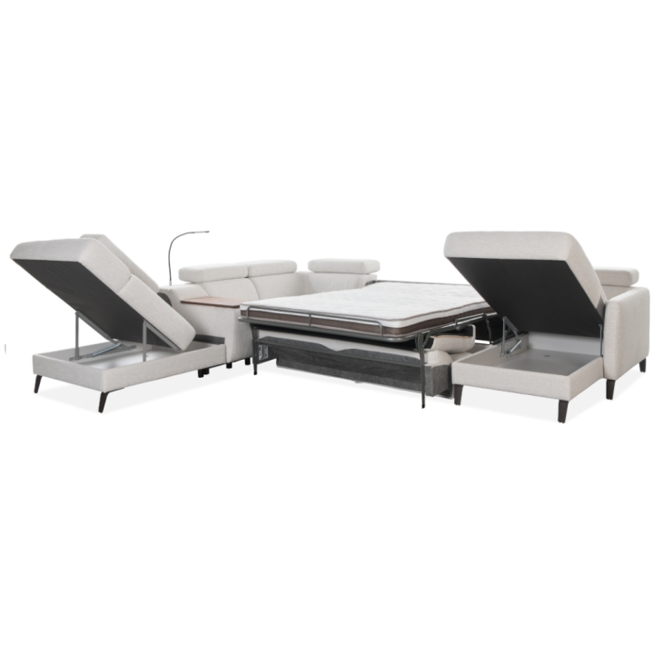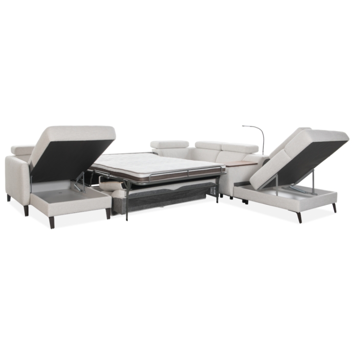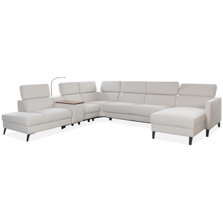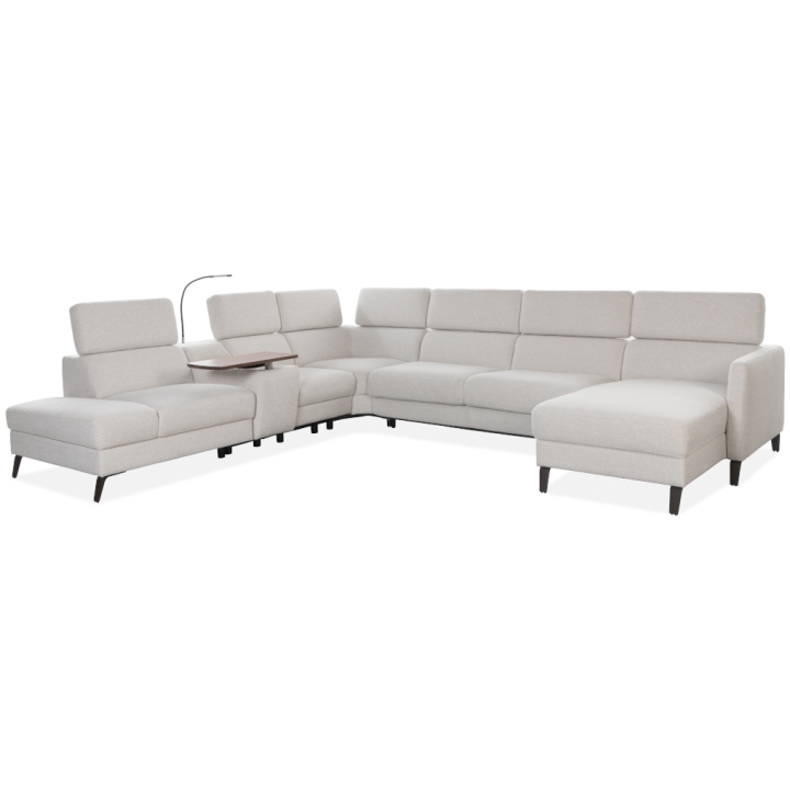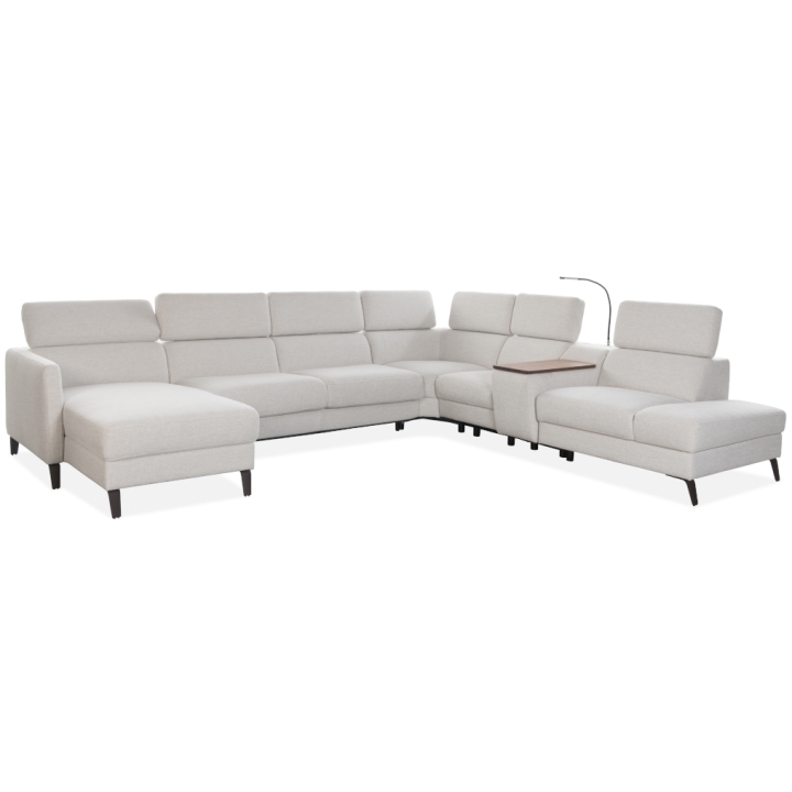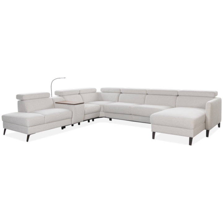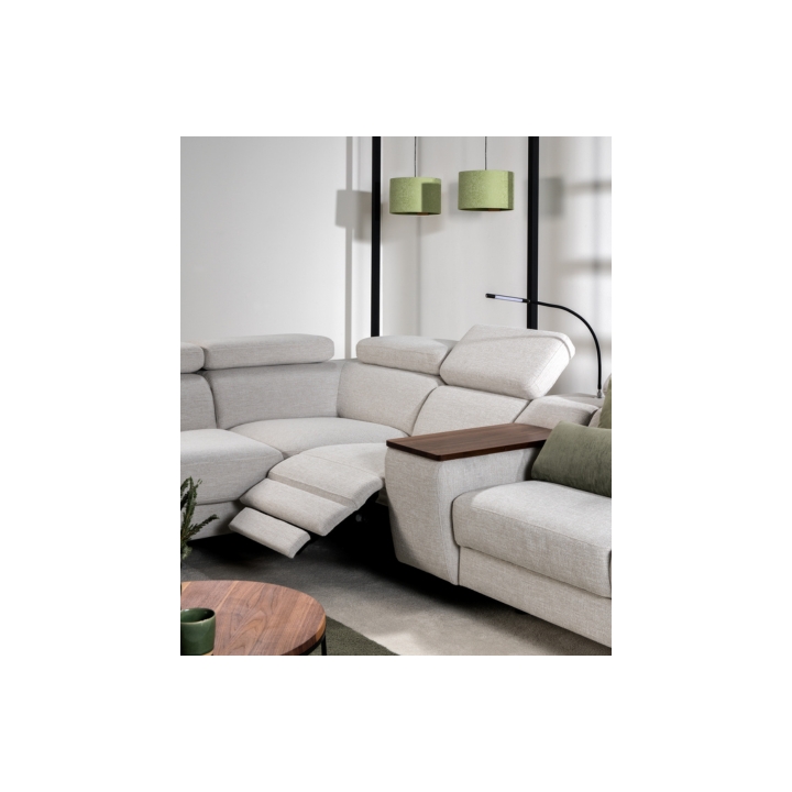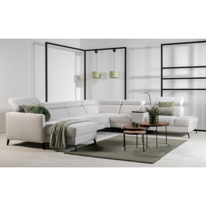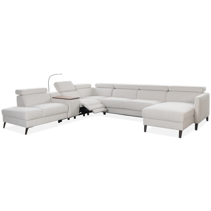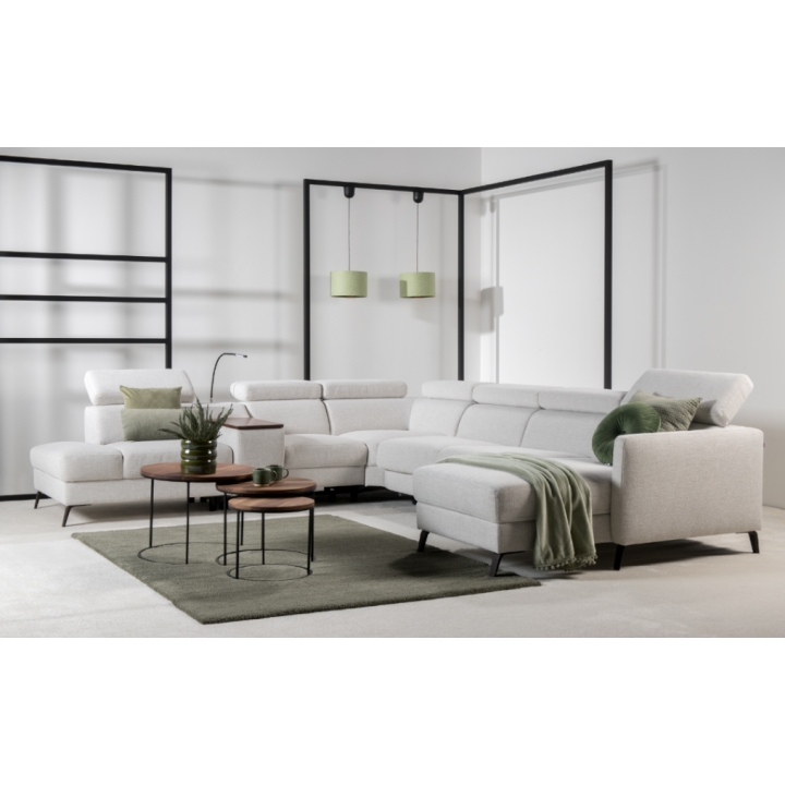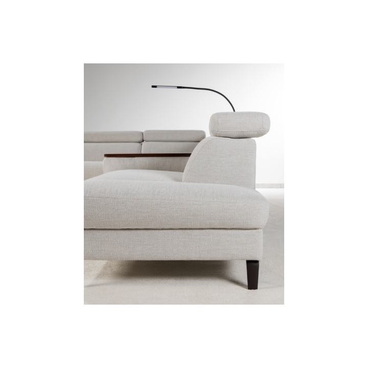 The Tulipano corner sofa by Meblosoft is an expansive piece of lounge furniture created with maximum user comfort in mind. It features a bar with an adjustable swivel oak top that conceals an induction charger, 230V sockets, USB ports and a touch-sensitive LED light with intensity control. In the seat integrated into the bar, there is a control panel for the electric relaxation function, which allows the footrest to be extended and the tilt of the backrest to be adjusted to suit your needs. Thanks to the adjustable headrests, the corner sofa allows for a fully customisable resting position.