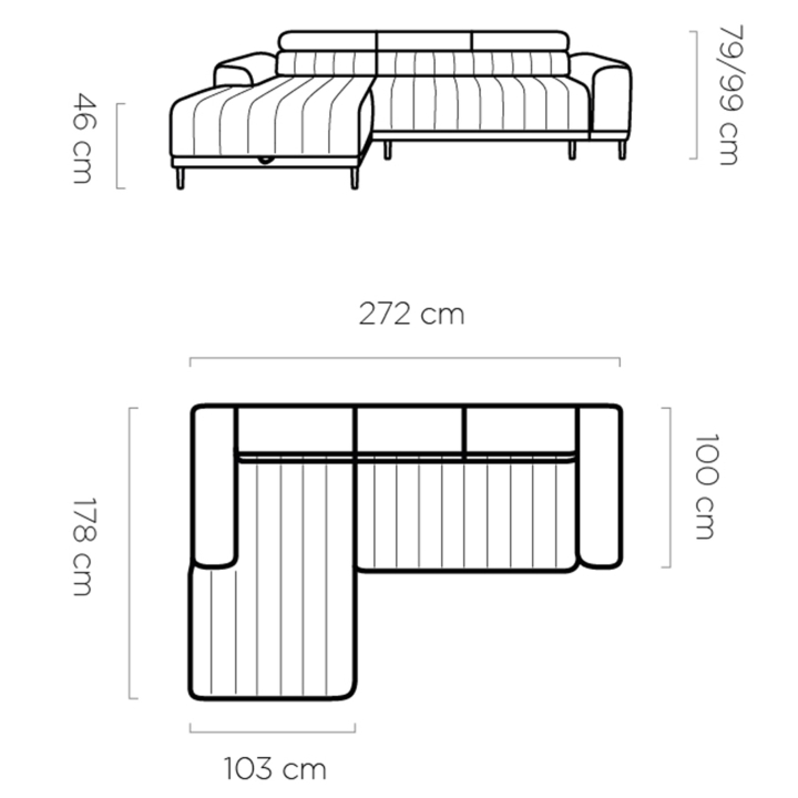 The impressive size of the furniture contributes to its comfort - the total width is 272 cm, the height is 79 cm (with the headrests extended it reaches 100 cm), while the depth is 178 cm on the ottoman side and 100 cm on the shorter side. The ottoman itself measures 178 cm deep and 103 cm wide, creating the conditions for relaxing in a reclining position. Underneath it, there is a bedding storage compartment measuring 16 x 65 x 165 cm, which makes it easy to store and organise home textiles.