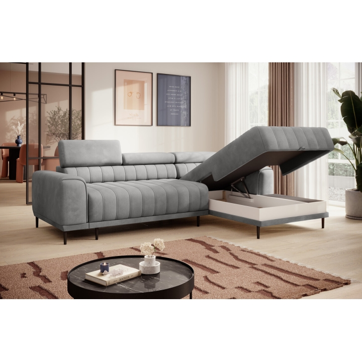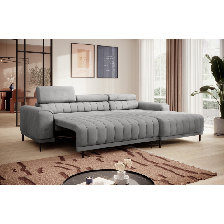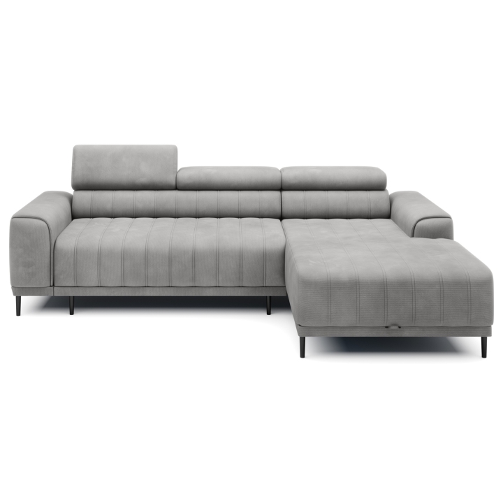 The Caldo Mini corner sofa by Versailles attracts the eye with its refined shape, which finds its place perfectly in contemporary arrangements. The option to choose a side - left or right - allows you to easily adjust the furniture to a particular interior layout. The characteristic vertical stitching on the seat and backrest, as well as the adjustable headrest and high, black metal legs give it a modern look.