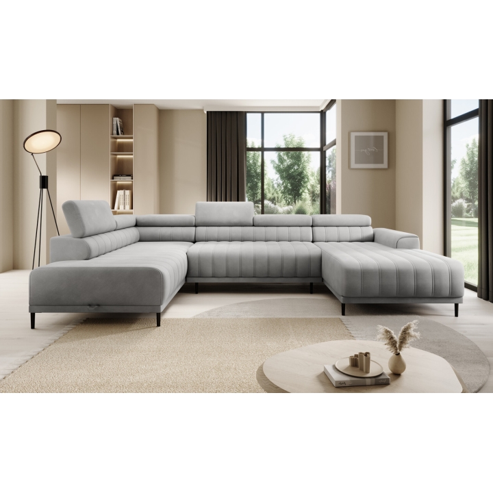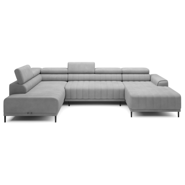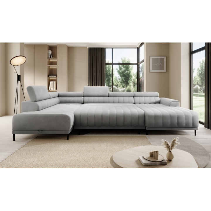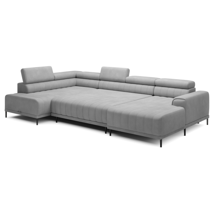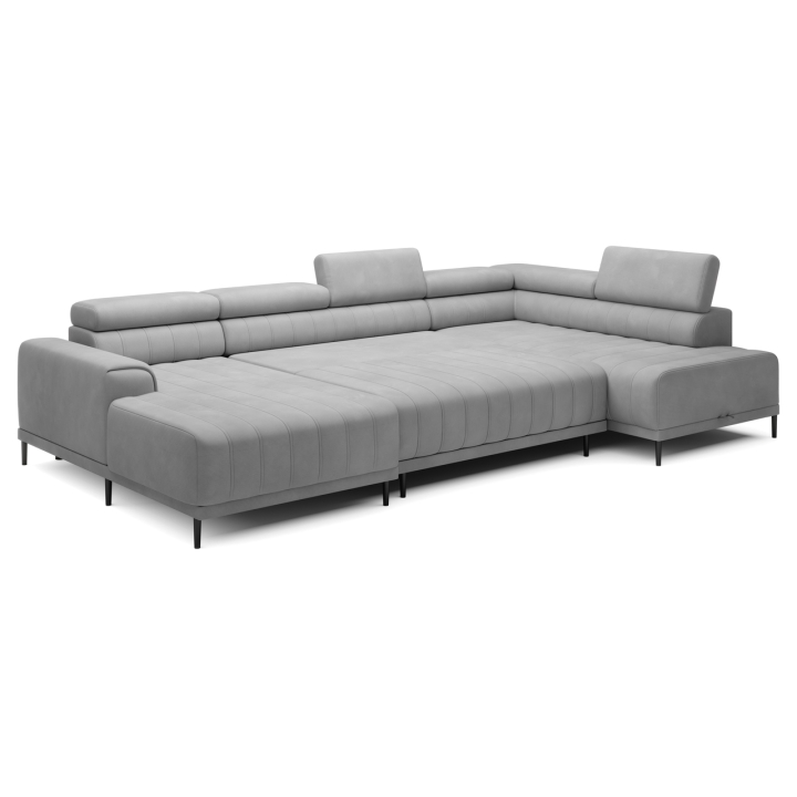 The Caldo XL corner sofa by Versailles is an expansive piece of lounge furniture that attracts attention not only with its considerable size, but also with its refined workmanship. The upholstery is enriched with vertical stitching, adding a noble touch and emphasising the precision of finishing. The structure is set on black, narrow metal legs that optically relieve the weight of the body, bringing lightness and space into the interior, and the possibility of adjusting the headrests allows for individual adjustment of the backrest to the user's needs.