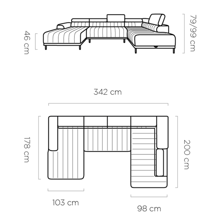 The entire structure measures 342 cm wide, 178 cm deep on the shorter side and 200 cm on the longer side. The overall height reaches 79 cm, and 99 cm when the headrests are raised to their maximum height. The seat sits at a height of 46 cm, with a central depth of 60 cm, which promotes a comfortable body position.