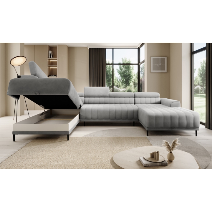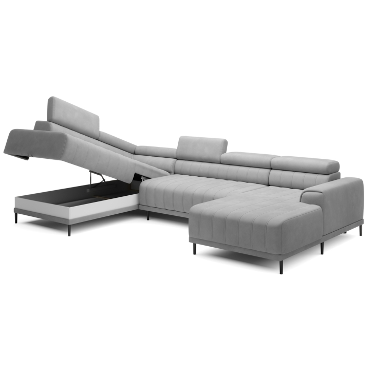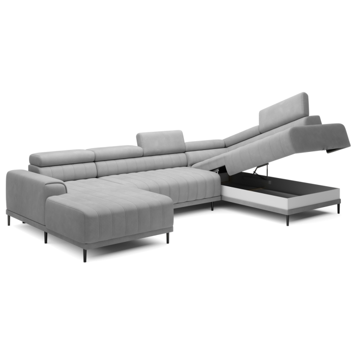 The U-shaped layout of the furniture is conducive to relaxing in various configurations. One side features a recliner 178 cm deep and 103 cm wide, ideal for relaxing in a semi-reclining position. The other side, ending in a longer ottoman (200 cm deep, 98 cm wide), not only offers a comfortable seat with a long backrest, but also conceals a capacious 16 × 82 × 190 cm bedding compartment. The side of the corner sofa is chosen taking into account the position of the recliner with armrest.