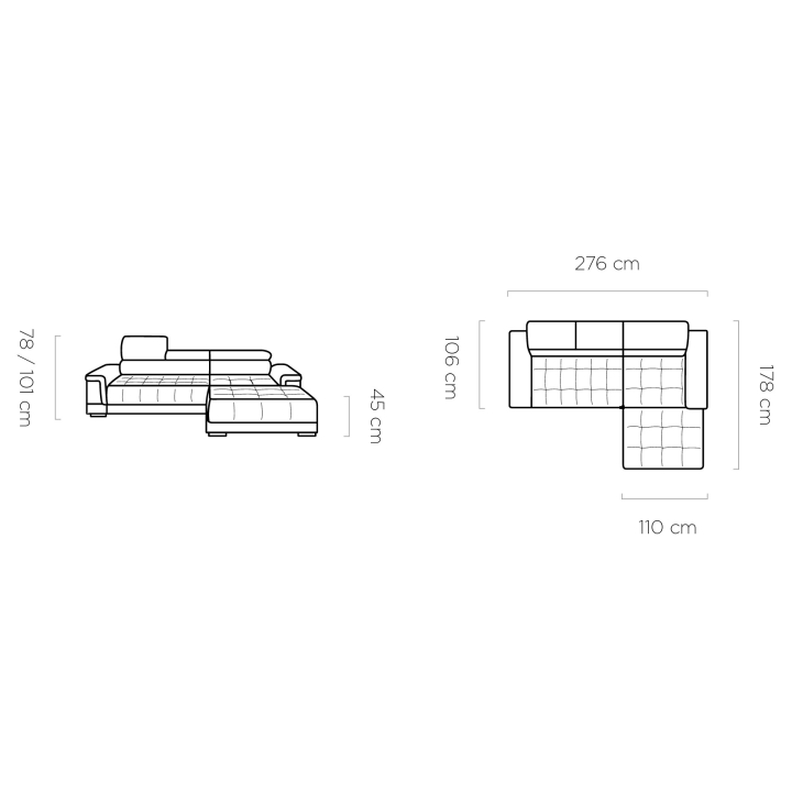 The total height of the corner sofa is 101 cm, the width is 276 cm and the seat height is 45 cm. The adjustable seat depth - from 61 to 88 cm - makes it possible to adjust the position to individual needs, while the ottoman measuring 110 × 133 cm provides a comfortable relaxation zone.