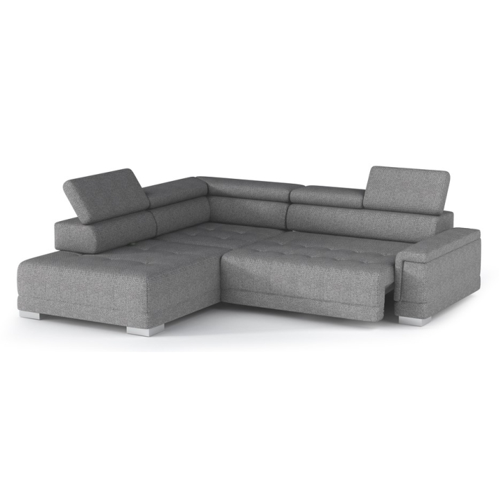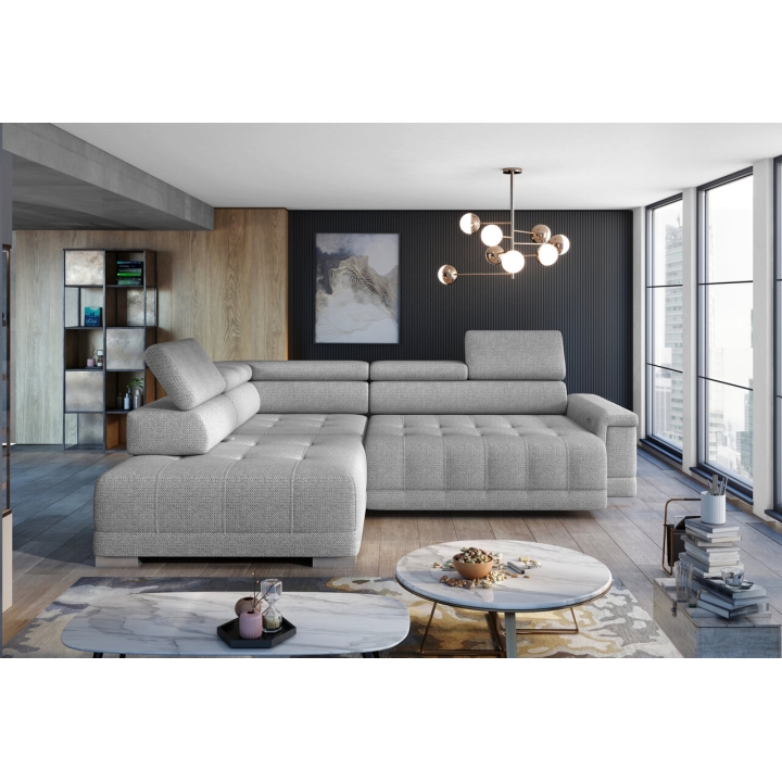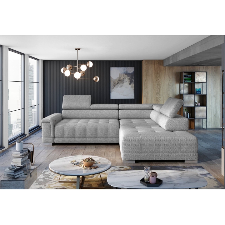 The structure of the corner sofa has been designed to allow a choice of left- or right-sided versions, allowing the furniture to fit freely into the layout of the room. Its interior uses N30 polyurethane foam combined with A-type corrugated springs, which translates into adequate resilience and resistance to deformation. The three movable headrests adjust to the adopted position, offering individual support for the cervical region.