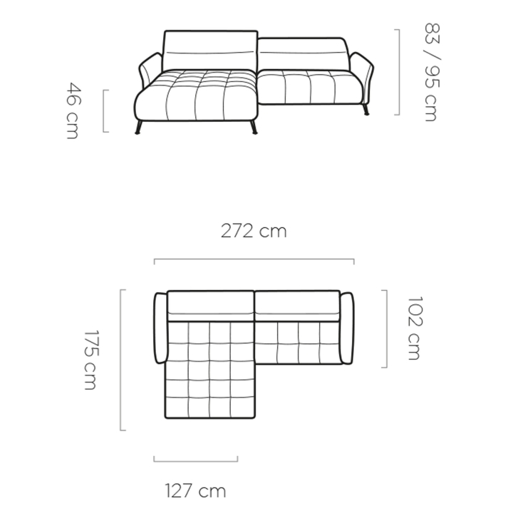 The dimensions of the corner sofa are 272 cm wide, 175 cm deep and between 83 cm and 95 cm high - depending on the positioning of the headrests. The seat height is 46 cm, making it suitable for both short relaxation and longer rests. Despite the lack of a bedding container, its design focuses on maximising sitting and lying comfort.