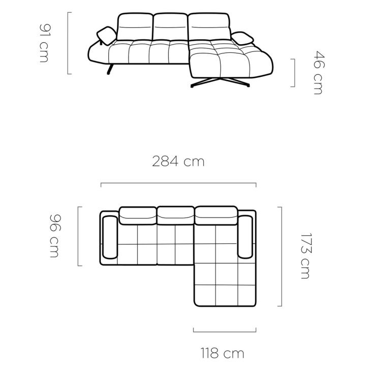 The ottoman measures 173 cm in length and 118 cm in width, while the depth of the seating part varies depending on the module - from 64 to as much as 112 cm. The length of the ottoman in the usable section is 153 or 140 cm, depending on the setting. The whole is supported by 17 cm high black metal legs.