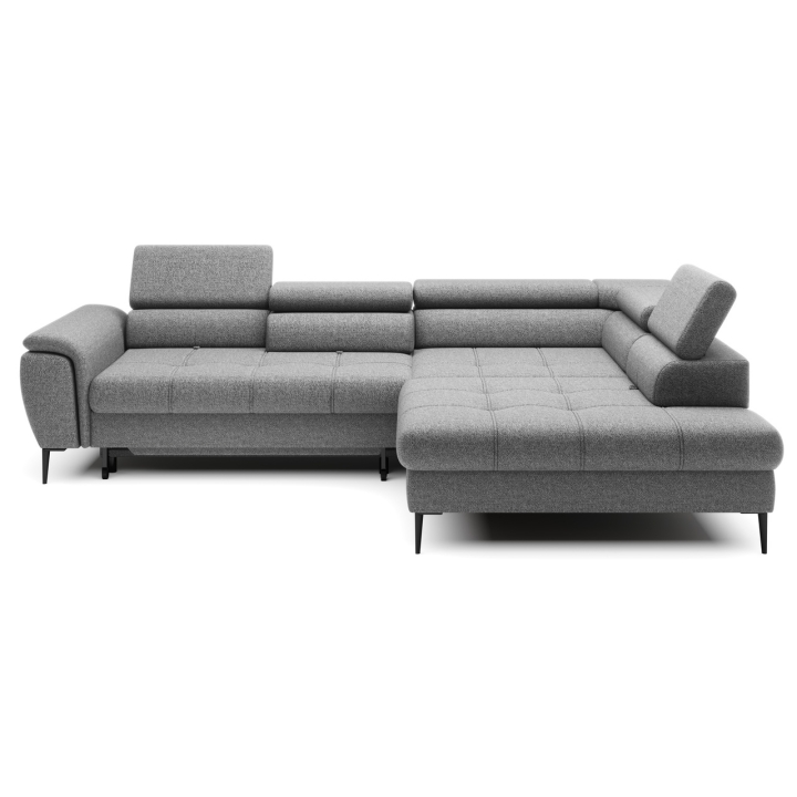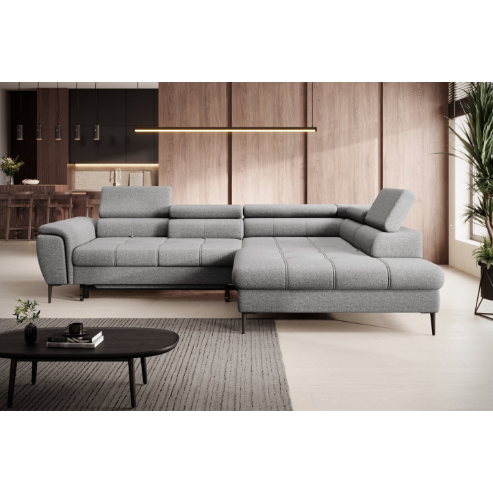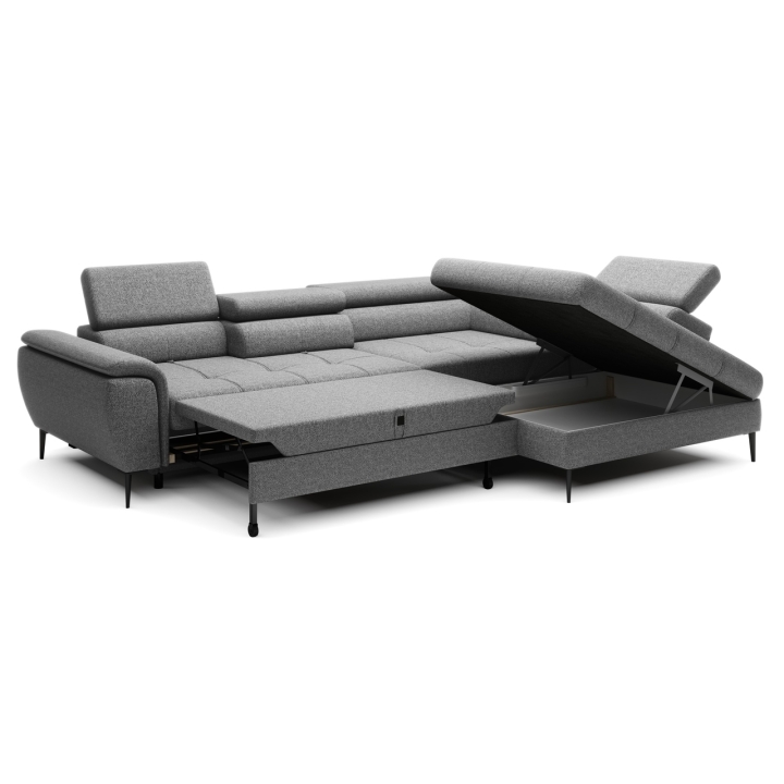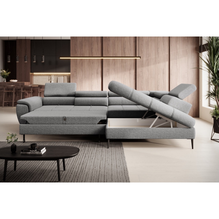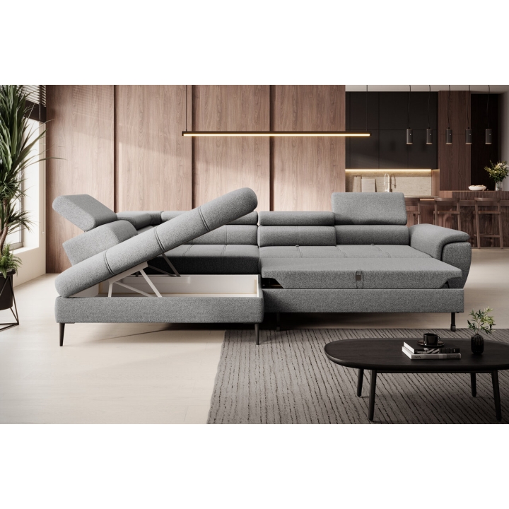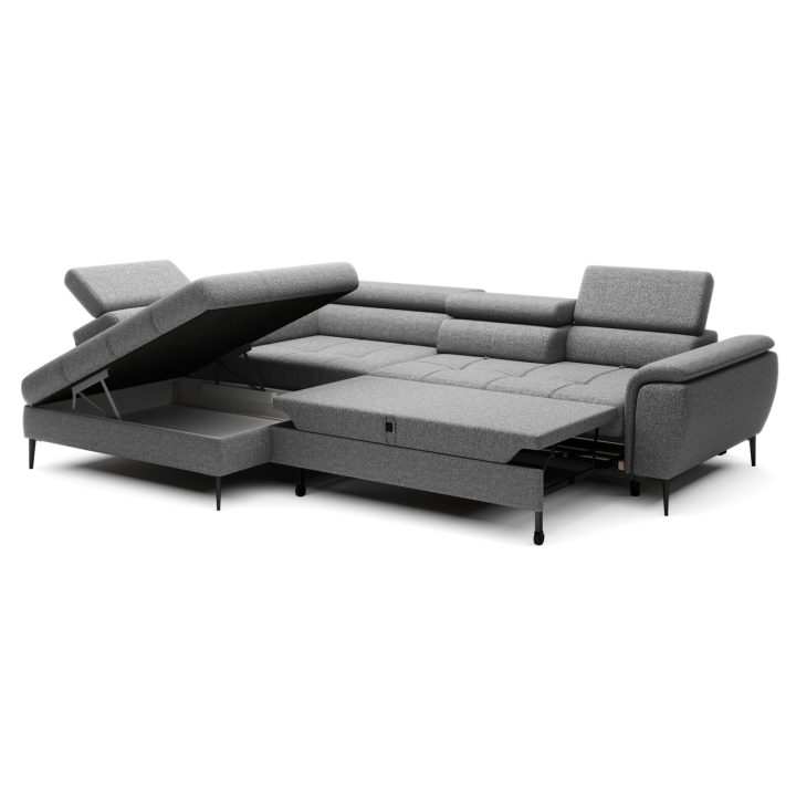 An additional function of the furniture is that it can be transformed into a 140x220 cm bed thanks to the Dolphin mechanism. This system allows for quick unfolding - the lower part slides out and the hidden mattress is raised to the height of the seat, creating a uniform sleeping surface. The corner sofa also includes a bedding storage compartment to keep things tidy and better manage space.