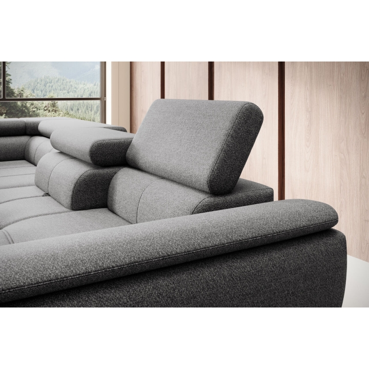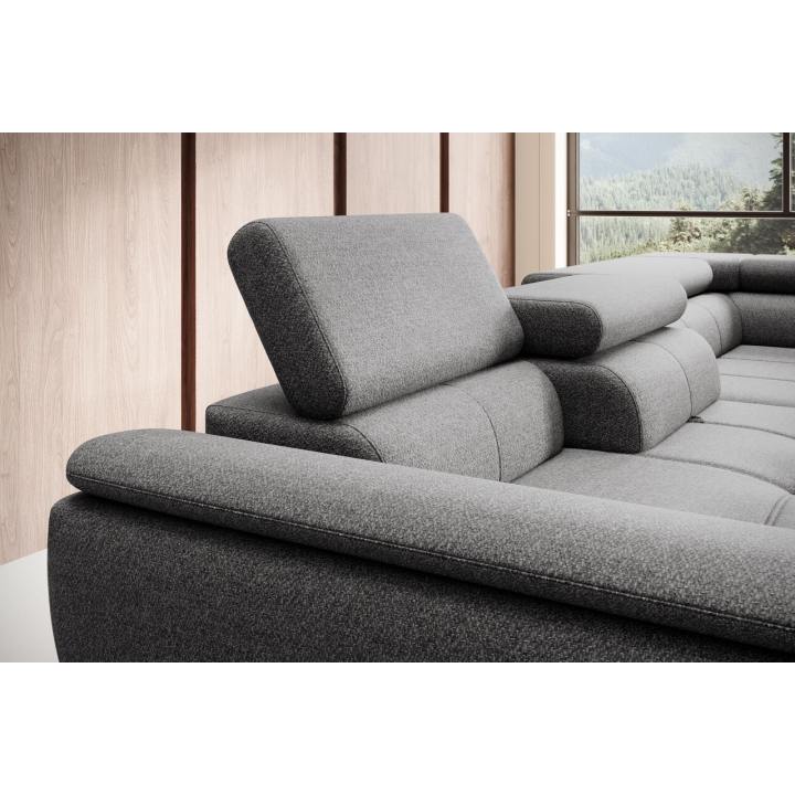 The height of the corner sofa is 77 cm, but thanks to the movable headrests this can be increased to 94 cm, achieving a better fit for the user. The sliding backrest ensures free adjustment and supports the spine regardless of the position adopted. The overall design is designed to maximise the different preferences during daily use.