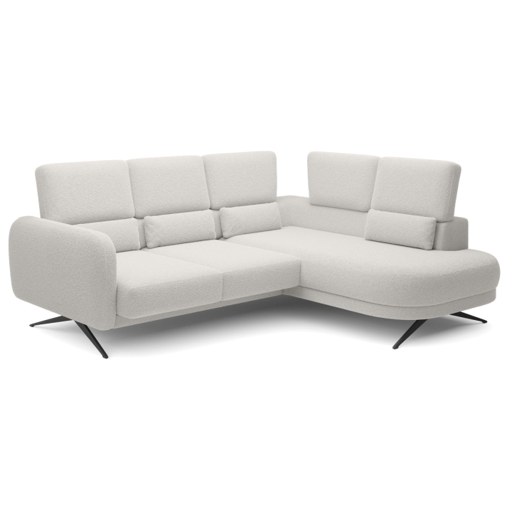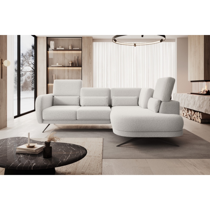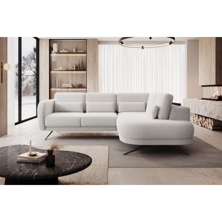 The whole rests on 17 cm high black metal legs, which optically relieve pressure on the structure and make it possible to keep the furniture clean underneath. This is complemented by elongated decorative cushions that offer support to the lower back and enrich the visual composition. This corner sofa is an unusual solution for those looking for a distinctive design element.