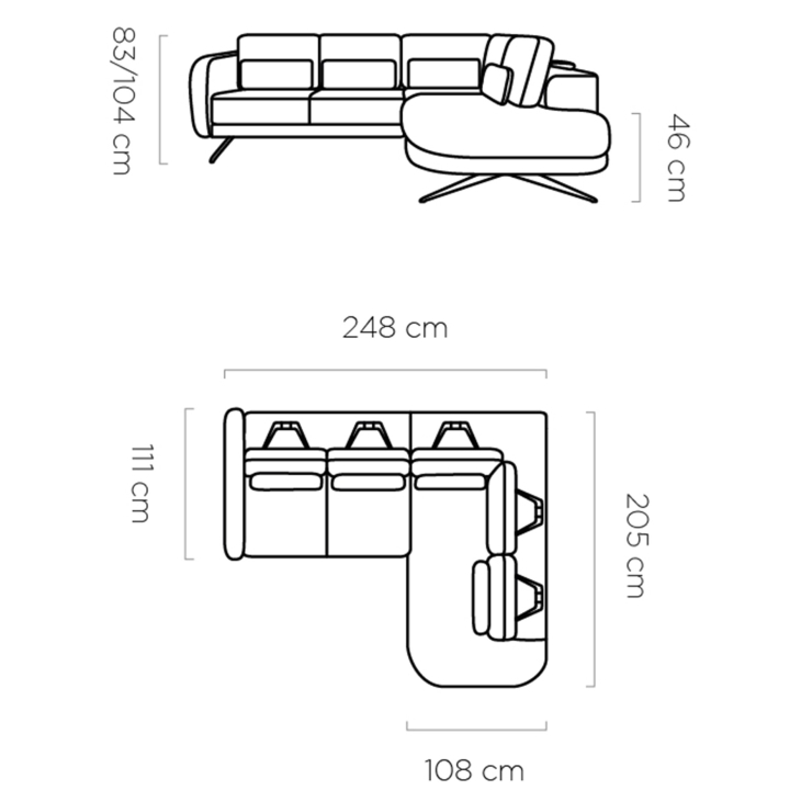 The total width of the corner sofa is 248 cm, with a depth of the longer side (ottoman side) of 205 cm and the shorter side (seat side) of 111 cm. The height of the piece of furniture is 83 cm, with the possibility of lifting the headrests up to 104 cm, which significantly increases comfort when relaxing. The seat is 46 cm high and its depth - measured with the backrest cushions - is 58 cm.