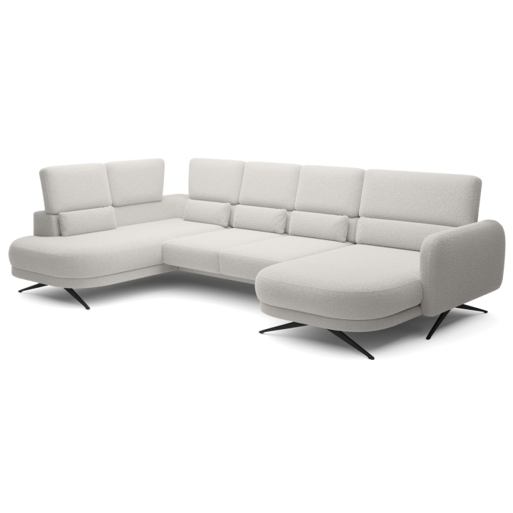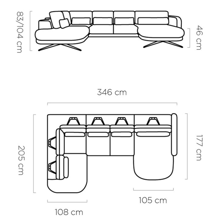 The total width of the corner sofa is 346 cm, the depth of the longer ottoman (with backrest and additional seats) is 205 cm, while the depth of the shorter ottoman (with armrest) is 177 cm. The height of the furniture is 83 cm, with the headrests adjustable up to 104 cm. The seat measures 46 cm high and 58 cm deep, and can be extended by an additional 17 cm thanks to an electric extension mechanism that works without the need for force.