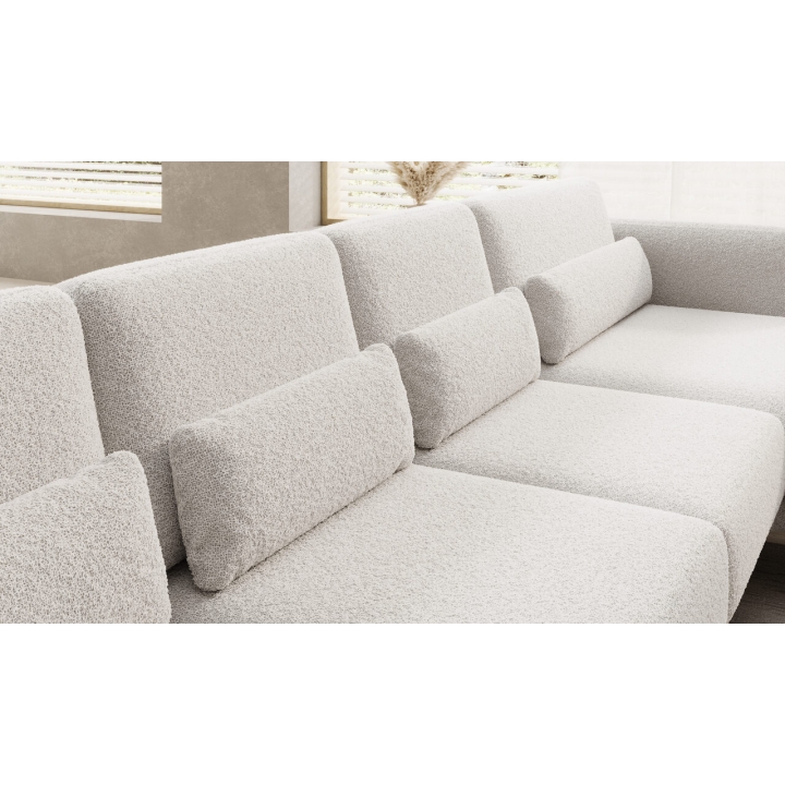 The whole is supported by 17 cm high black metal legs, which add lightness to the structure and make it easier to keep the furniture tidy underneath. Additional decorative cushions, elongated and soft, not only provide support for the lumbar region, but also emphasise the character of the furniture, adding depth and definition.