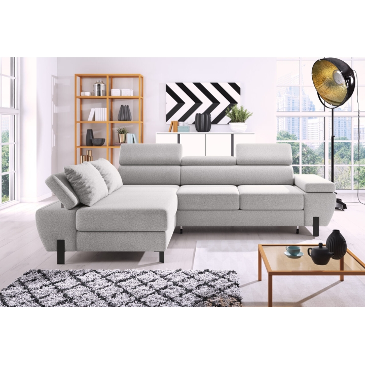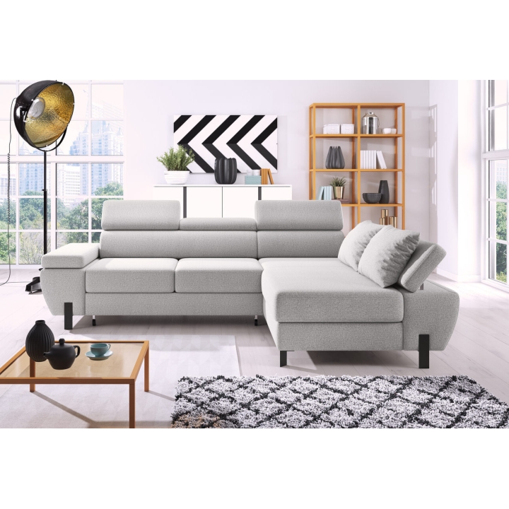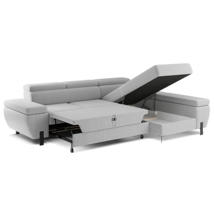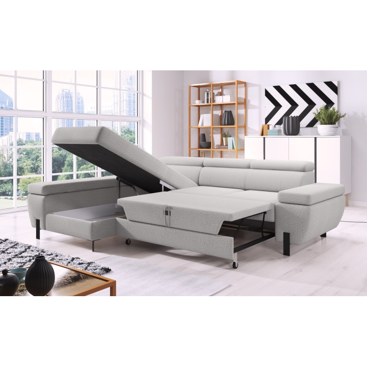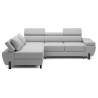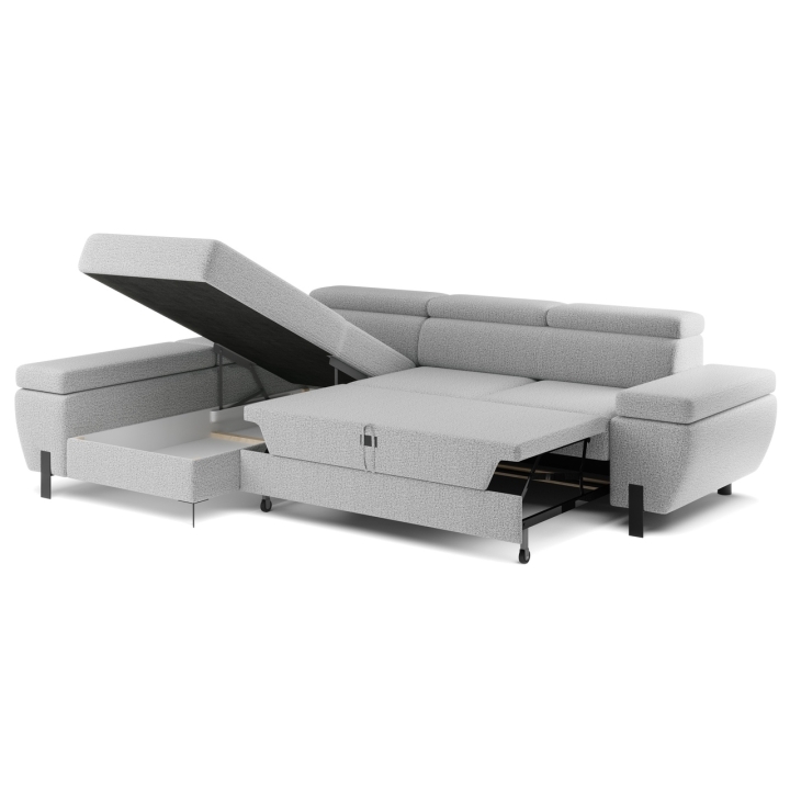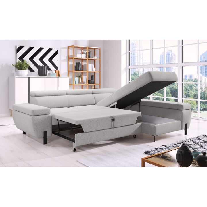 One of the more advanced solutions in this model is the dolphin sleeping function, which allows the corner sofa to be easily transformed into a night rest area. This system involves pulling out the lower part of the furniture and lifting the hidden mattress, giving a sleeping area of 125x210 cm.