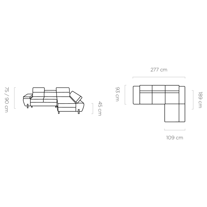 The dimensions of the corner sofa are 277 cm wide and 75 cm high in the standard setting, reaching a height of 90 cm when the headrests are unfolded. The seat is placed at a height of 45 cm and is 59 cm deep, providing stable and comfortable support. The longer side of the furniture measures 189 cm deep (on the ottoman side), while the shorter side reaches 93 cm deep.