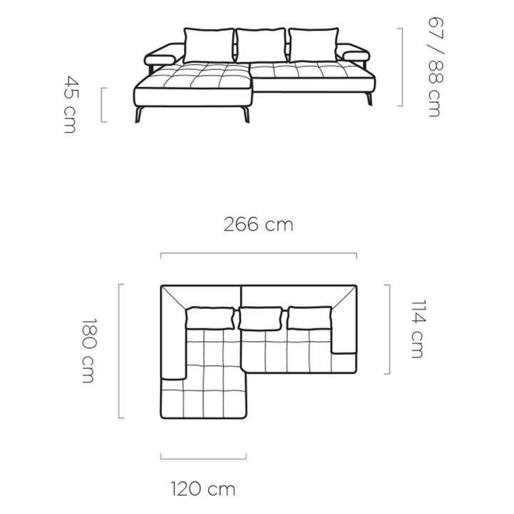 The total dimensions of the corner are: 266 cm wide, 67 cm high (88 cm with cushions), 180 cm deep on the ottoman side and 114 cm on the seat side. The seat height is 46 cm and the 120 cm wide ottoman allows for full relaxation in the reclining position. Thanks to the electric seat extension, it is possible to increase the depth of the lounger, and when fully extended, a sleeping space of 109×200 cm is created - ideal as an occasional sleeping area.