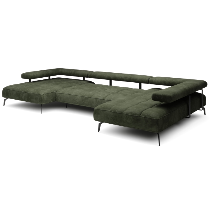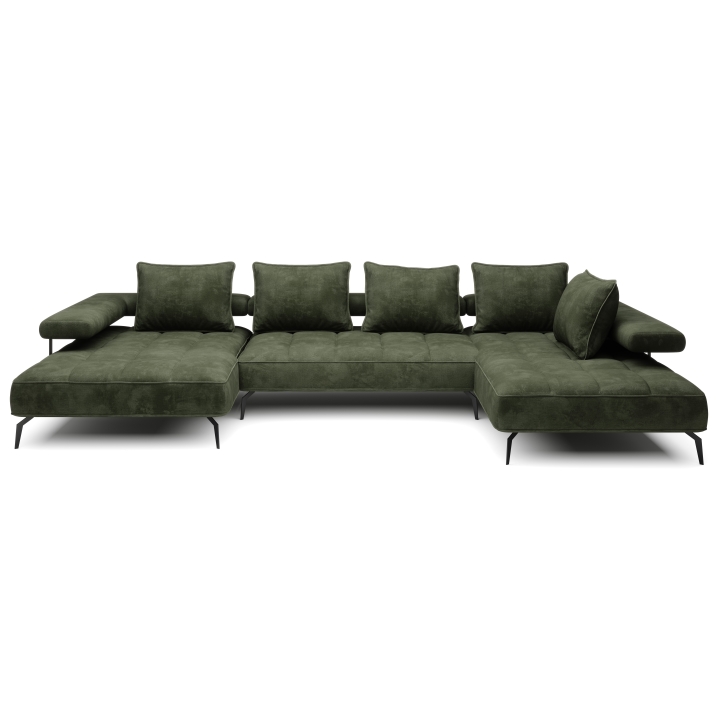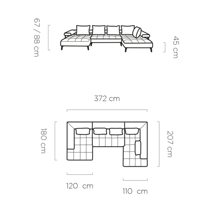The furniture's dimensions emphasise its impressive presence - the total width is 372 cm, the depth of the longer ottoman is 207 cm and the shorter one is 180 cm. The overall height of the furniture reaches 88 cm, while the seat is 45 cm high and 82 cm deep (including the backrest cushions). The characteristic vertical stitching on the seat gives the piece a modern and distinctive character, while exposing the quality of the fabric used.