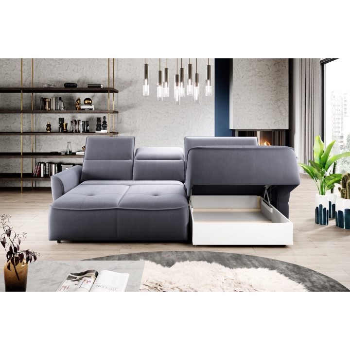 The functionality of the corner sofa does not end with the adjustable extension, as when unfolded it gains a sleeping area of 227 x 115 cm, making it ideal for various occasions. There is also a bedding container under the ottoman, which helps to keep the room tidy. This makes the corner sofa a multi-purpose piece of furniture, catering for a variety of user needs.