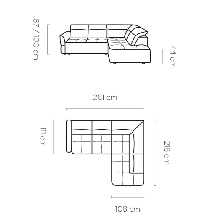 The dimensions of Murillo L corner sofa are 261 cm wide, 87 cm high (with the possibility of extending the headrests to 100 cm), 218 cm deep on the longer side (ottoman side) and 111 cm deep on the shorter side (seat side). The ottoman is distinguished by its width of 108 cm, which ensures adequate spaciousness and comfort. The corner sofa is available in right- and left-hand versions, which makes it adaptable to almost any interior, regardless of the layout of the space.