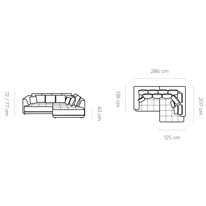 The furniture is available in two variants - left and right - which facilitates its placement in various living spaces. The total width of the corner is 286 cm, while the depth on the ottoman side is 207 cm and the shorter side measures 136 cm. The overall height of the structure reaches 77 cm, thanks to which the unit maintains harmonious proportions without overwhelming the interior.