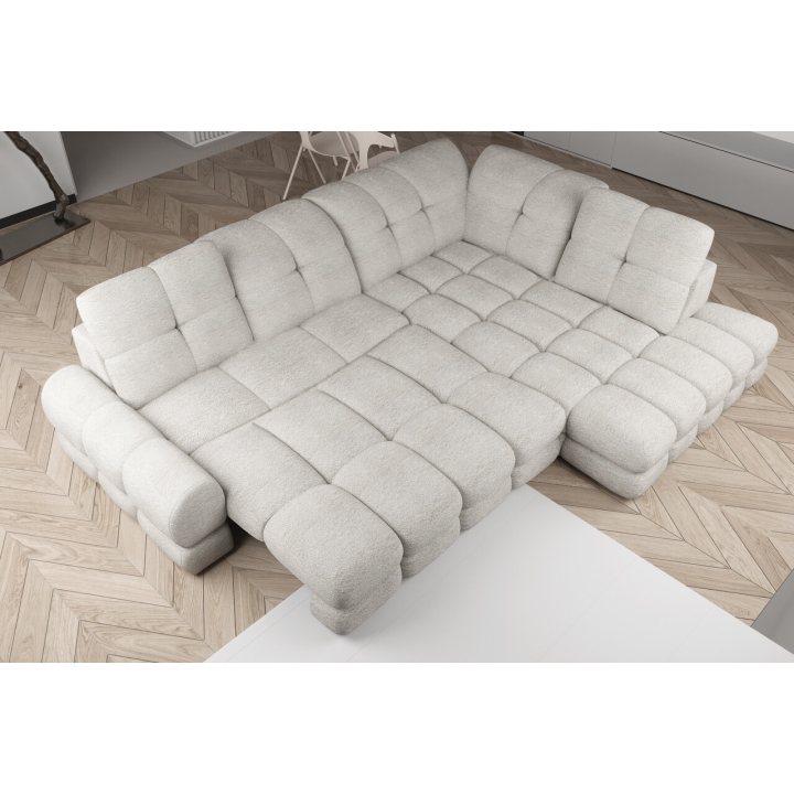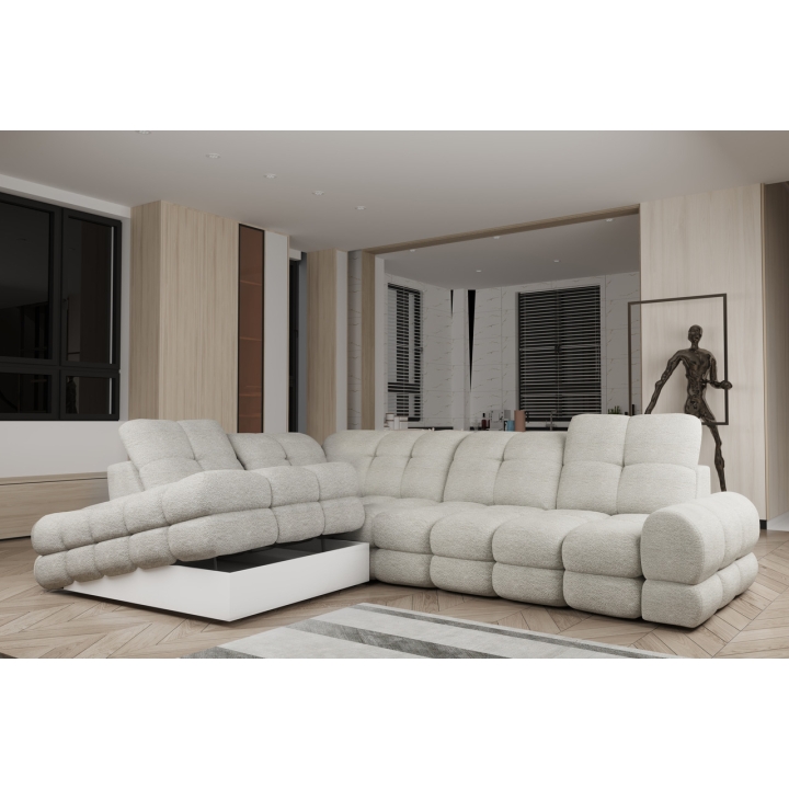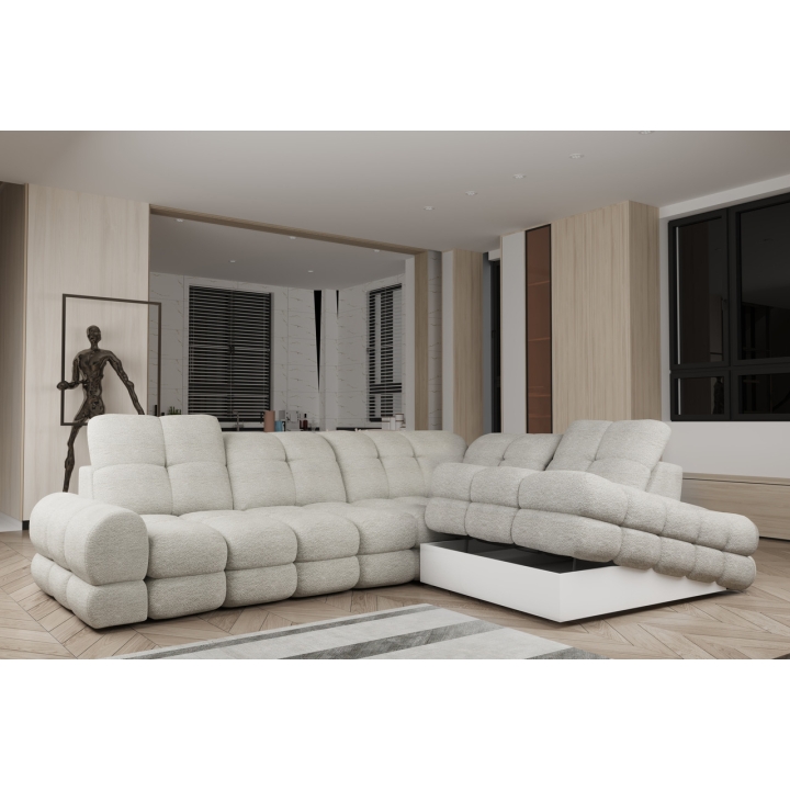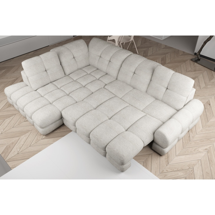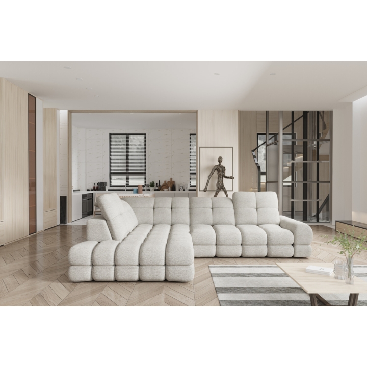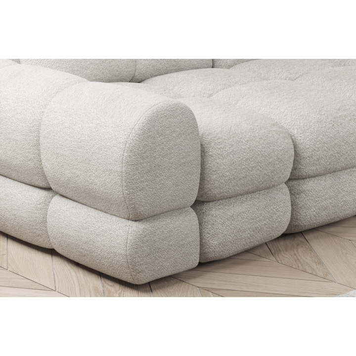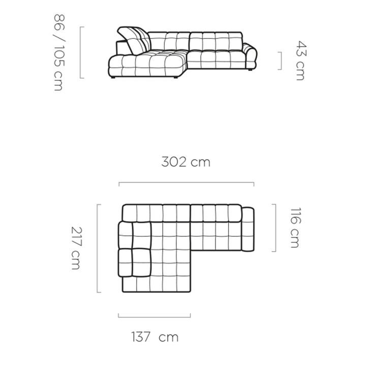 The total width of the furniture is 302 cm, the depth of the side ending in the ottoman is 217 cm, while the shorter side measures 116 cm. The width of the ottoman is 137 cm - this parameter makes it an ideal place for a moment of rest during the day, in a position conducive to relaxation. Inside the ottoman, there is ample storage space that will successfully accommodate additional textiles or other home accessories.