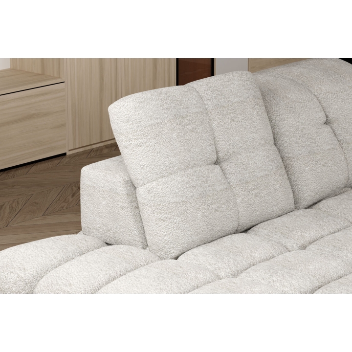 The characteristic vertical stitching decorating the seat and backrest gives the entire structure a rhythmic, orderly appearance. This type of detail not only has a decorative function, but also emphasises the thoughtful form of the furniture. The seat, 66 cm deep, can be further enlarged by using the SUPERLONG electric mechanism, which allows it to be extended to a maximum depth of 126 cm, thus creating a comfortable sleeping space of 126 x 227 cm.