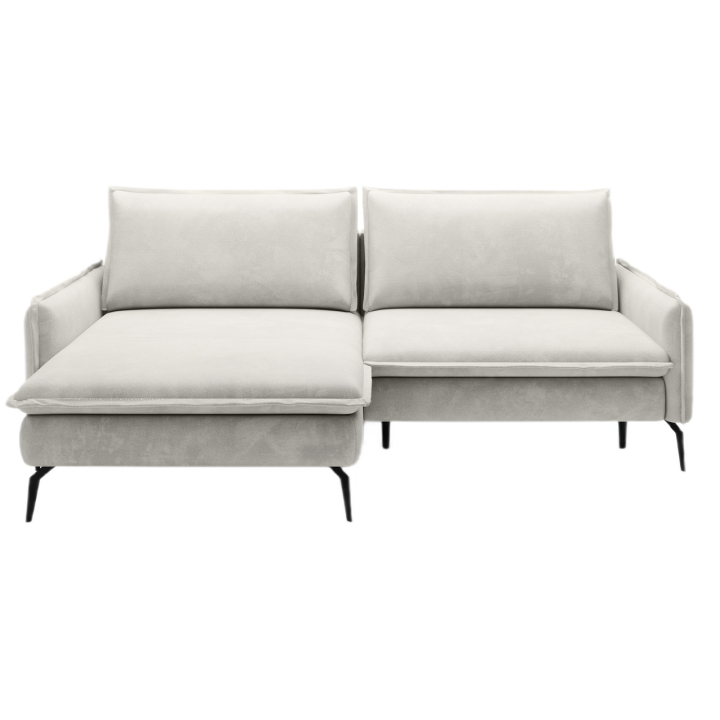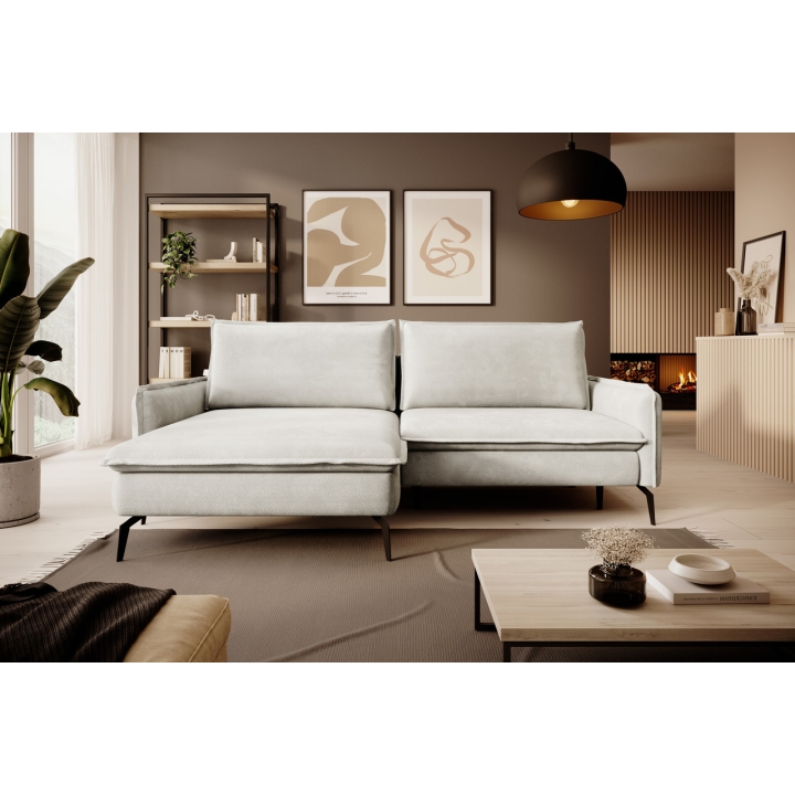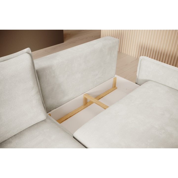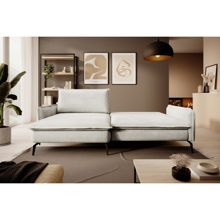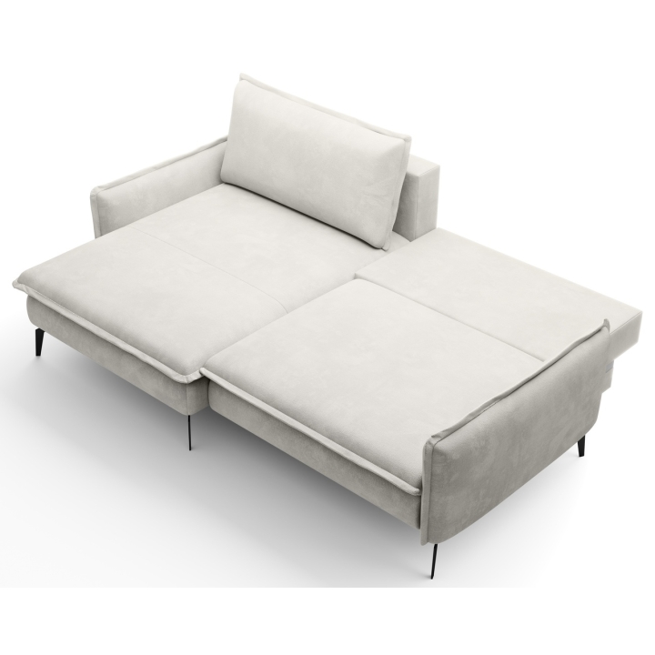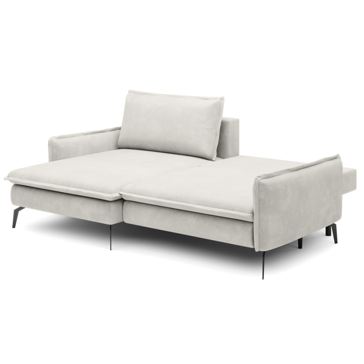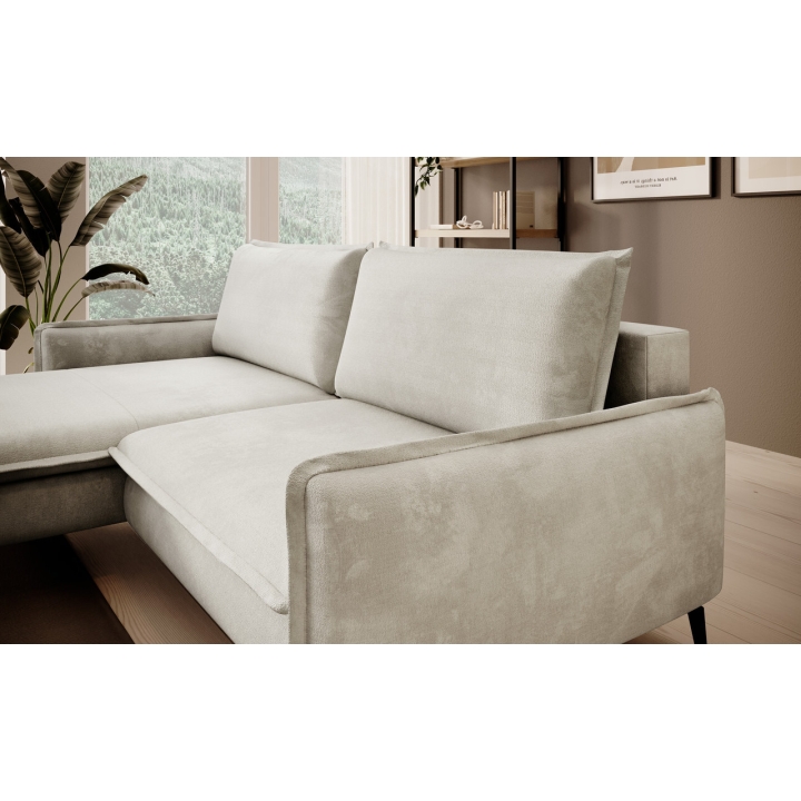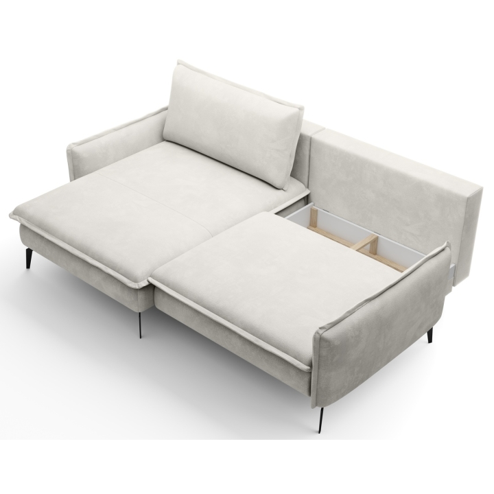 Despite its sleek size, the corner sofa also offers the possibility of transforming it into a sleeping space. A DL-type mechanism is used here, in which the seat slides forward and the backrest folds into the resulting space, creating a sleeping surface measuring 126x201 cm. In addition, the furniture includes a bedding container - a practical storage compartment hidden under the seat, which is perfect for storing textiles or extra blankets.
