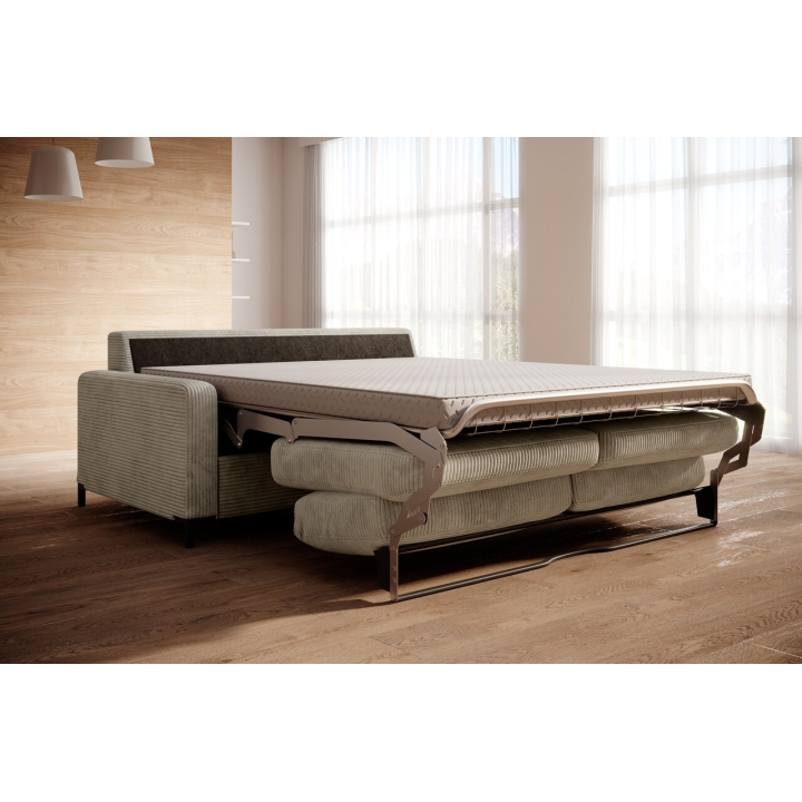 Despite its compact design, the Tino S120 sofa conceals a fold-out sleeping area, based on a mechanism of the Italian frame type. This mechanism allows, after removing the cushions, to unfold the metal frame with the mattress hidden inside, reminiscent of a classic bed. The resulting sleeping surface is 120x200 cm.