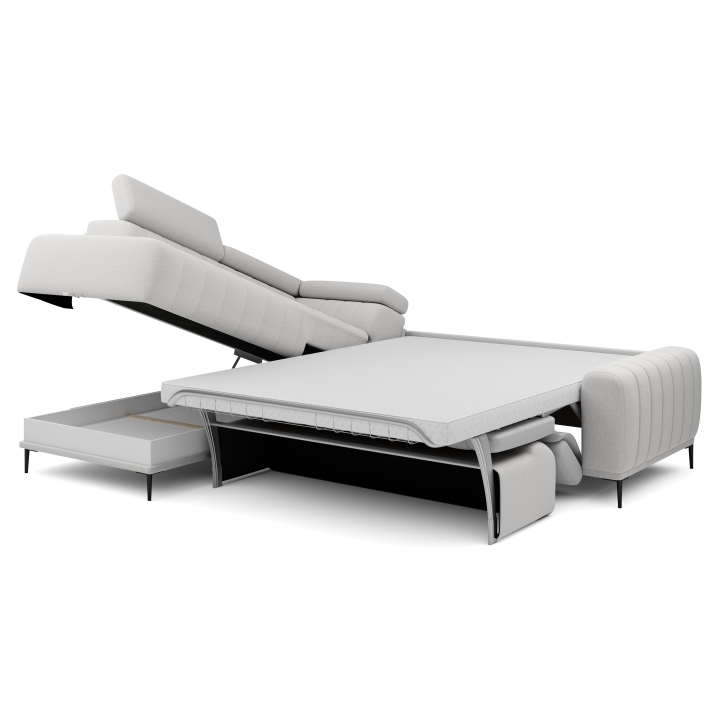 Under the ottoman there is a storage compartment designed for bedding or other textiles, providing additional space without disturbing the order of the room. The corner sofa is also equipped with a sleeping function based on an Italian frame - after removing the seat cushions, the metal structure with a mattress unfolds, creating a sleeping space of 120 × 197 cm, similar to a traditional bed.