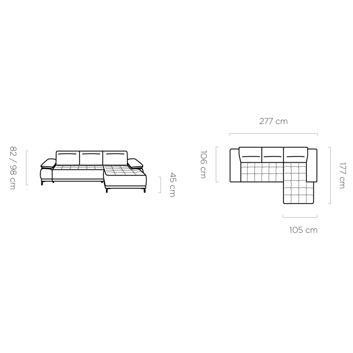 The total width of the structure is 277 cm, the basic height is 82 cm, and after unfolding the headrests it increases to 98 cm. The longer side of the corner measures 177 cm, with the ottoman measuring 105 cm wide, making it a convenient place to relax in a semi-reclining position. The shorter side of the piece of furniture reaches a depth of 106 cm, which ensures harmonious proportions of the whole and allows it to blend freely into a variety of interiors.