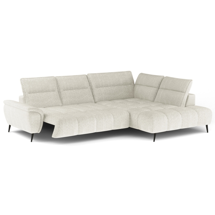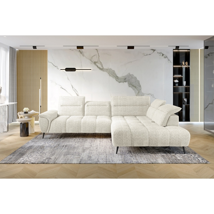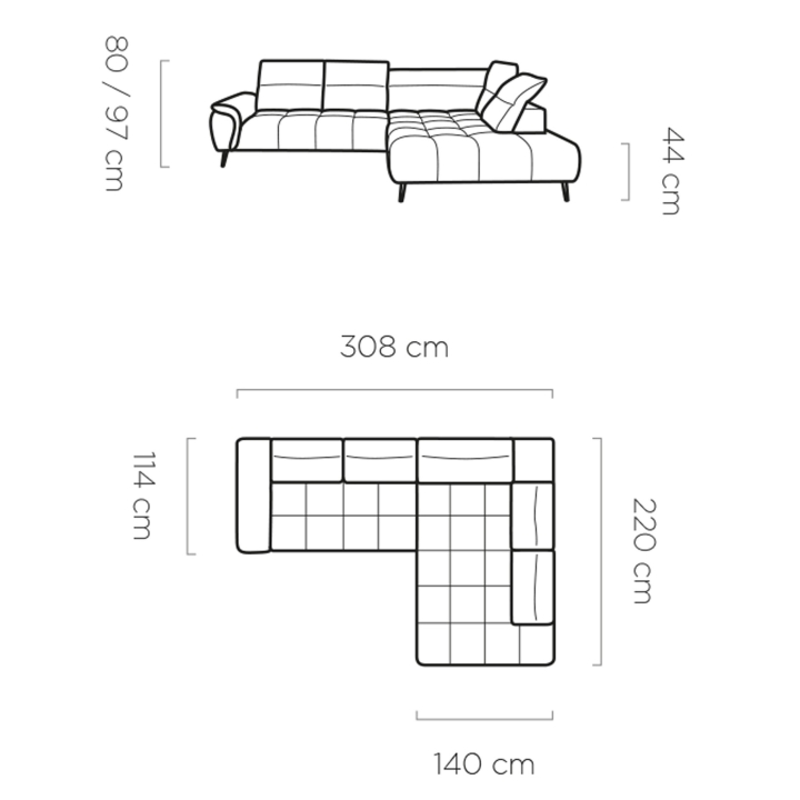 The total width of the corner sofa is 308 cm, the height is 80 cm - and with the headrests raised to the maximum it reaches 97 cm. The shorter side (on the seat side) is 114 cm deep, while the longer side (on the ottoman side) is 220 cm long, and the ottoman itself is 140 cm wide. The seat is at 44 cm from the floor and is set on slender metal legs, which gives the structure a lightness. The furniture is available in a right or left-hand version, depending on the arrangement needs.