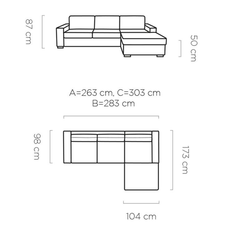 The model is available in three widths, both as a left- and right-side variant, which makes it possible to adjust it to the specific layout of the room. The total width of the furniture is 283 cm, the height is 87 cm, and the seat height is 50 cm. The depth of the longer side (at the ottoman) is 173 cm, while the ottoman itself is 104 cm wide, providing convenient conditions for relaxing during the day. The shorter side reaches a depth of 98 cm. The depth of the seat without cushions is 59 cm, while the surface of the ottoman is 134 cm.