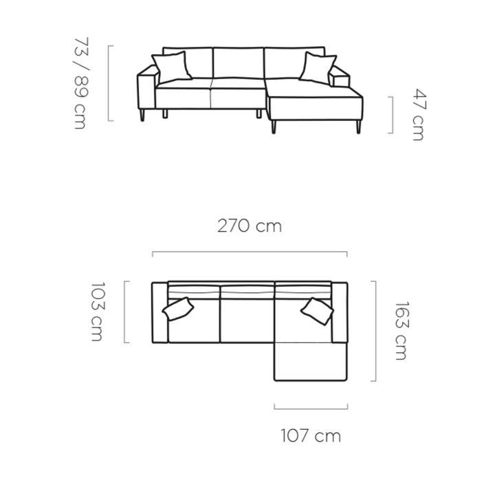 The total width of the corner sofa is 270 cm, while the height including cushions is 89 cm. The structure is set on slender metal legs in black, which adds some lightness to the whole. The depth of the shorter side (on the seat side) is 103 cm, while the longer side (on the ottoman side ) measures 163 cm with an ottoman width of 107 cm.