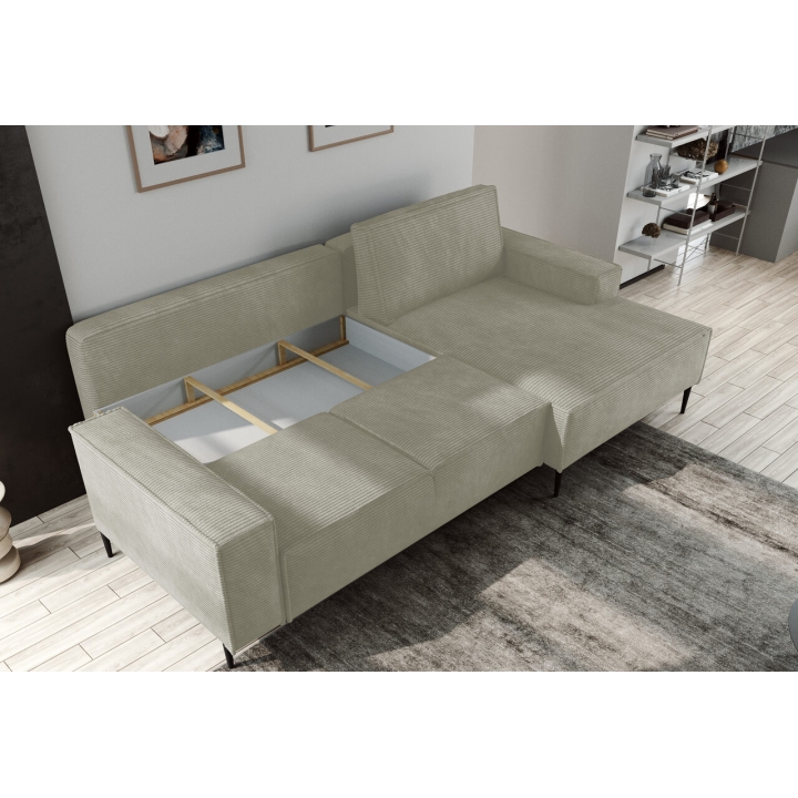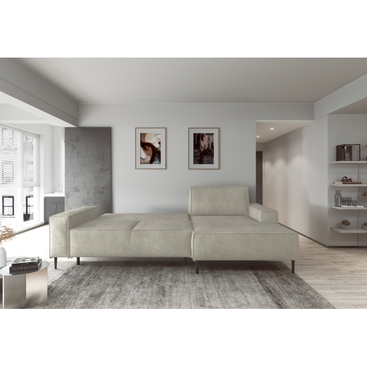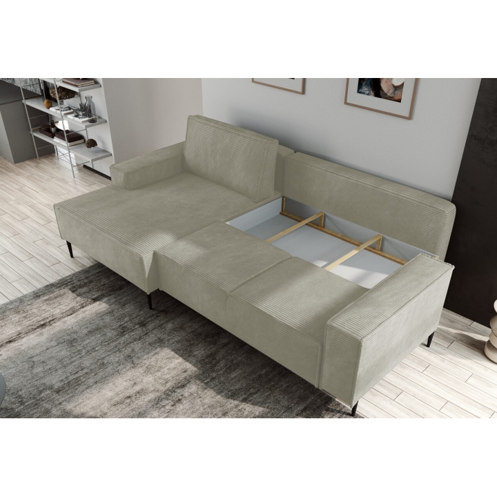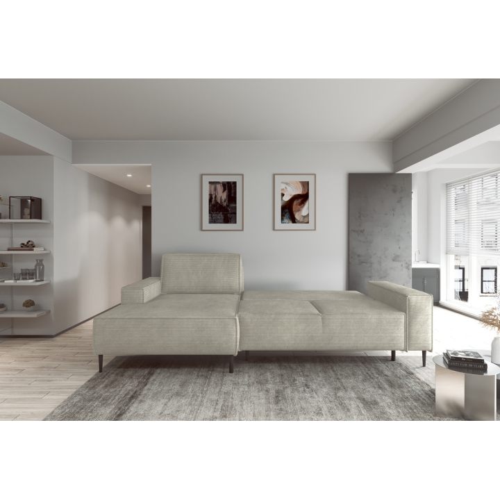 Matano has been enriched with a folding sleeping surface, the mechanism of which is based on the DL system - the seat extends smoothly forward, and the backrest lays horizontally, creating a sleeping space of 129x225 cm. This solution is ideal for situations where there is a need to overnight guests or to get an additional seating area. At the same time, the design conceals a spacious storage compartment for bedding, which makes it easier to organize textiles and keep the living room tidy.